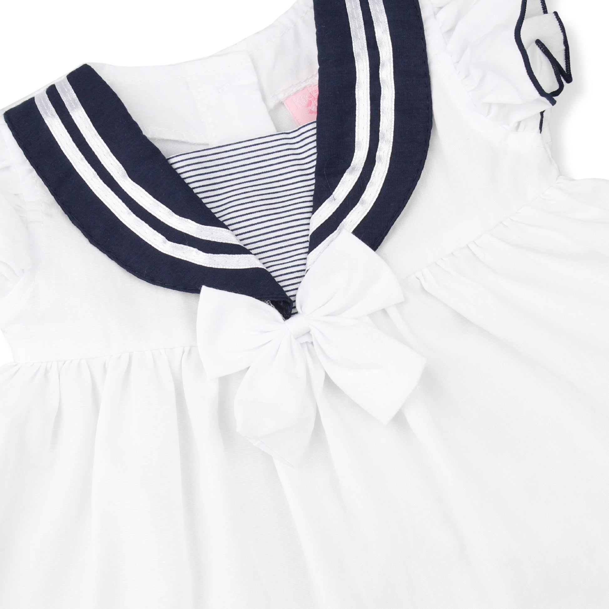 The dress features a traditional sailor-style collar with navy trim, a striped chest panel, and a large bow at the waist for a pretty finishing touch. Frilled sleeves and a contrast hem add to the traditional look, while the elasticated bloomers offer comfort and practicality for everyday wear.