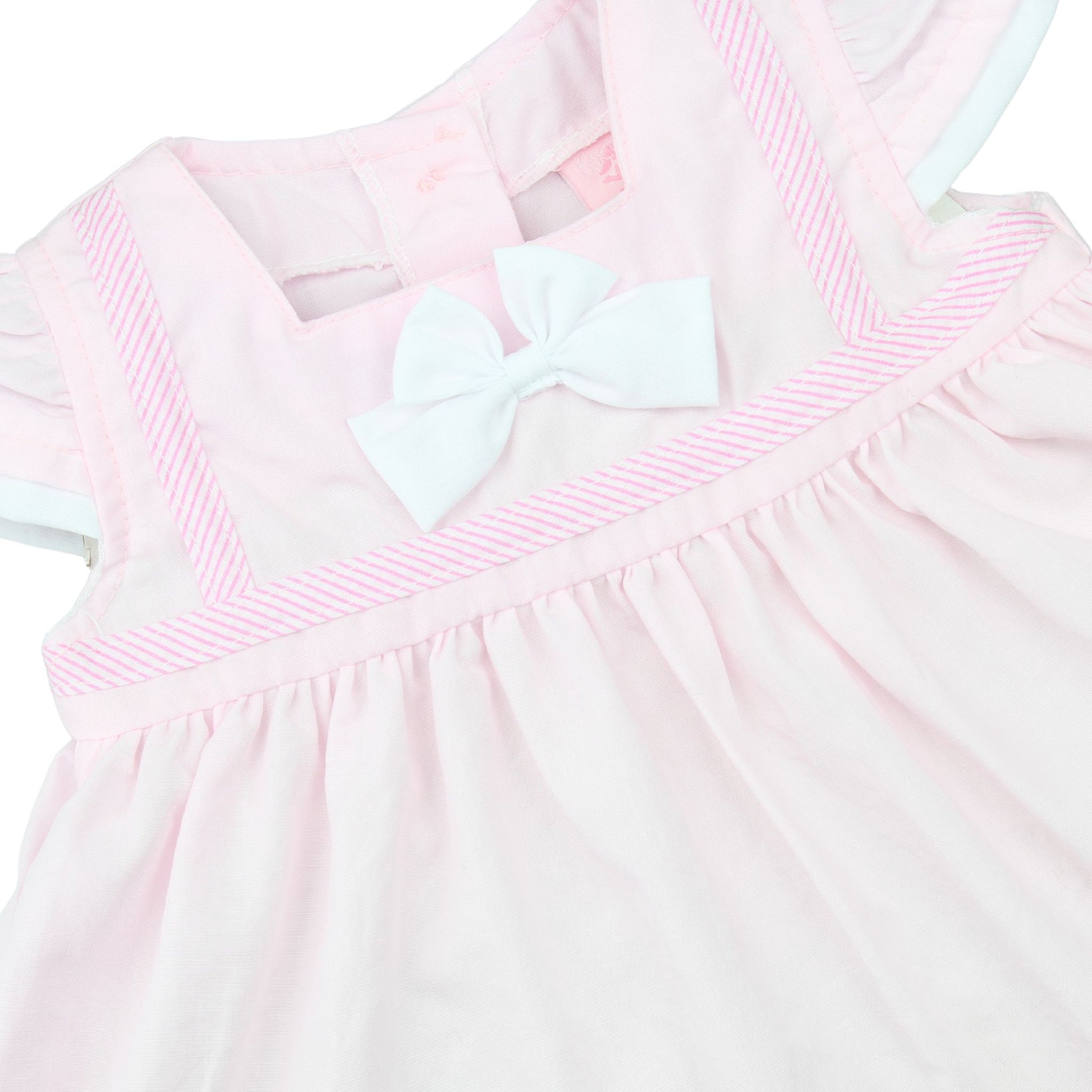 A beautifully soft baby girls dress set in a pale pink shade, perfect for spring, summer, and special occasions. The short-sleeved dress features a delicate white bow at the chest, soft gathered skirt, and subtle striped trim along the hem for a classic, traditional look.