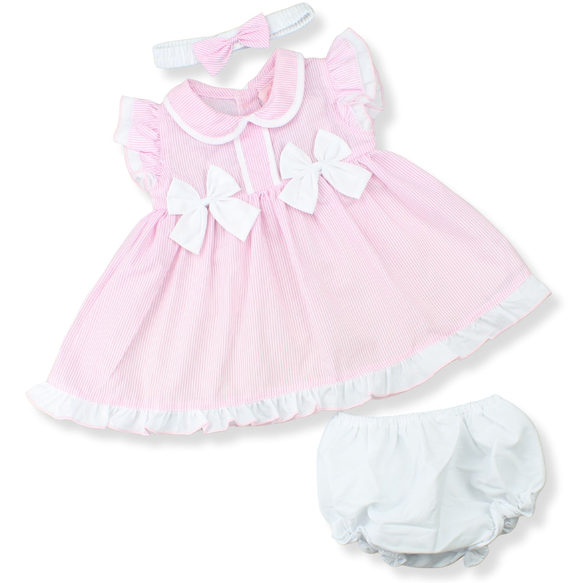 A lovely and affordable three-piece outfit for baby girls, designed in soft pink and white pinstripes for a classic, traditional look. This set includes a short-sleeved dress, matching knickers, and a coordinating headband to complete the outfit.