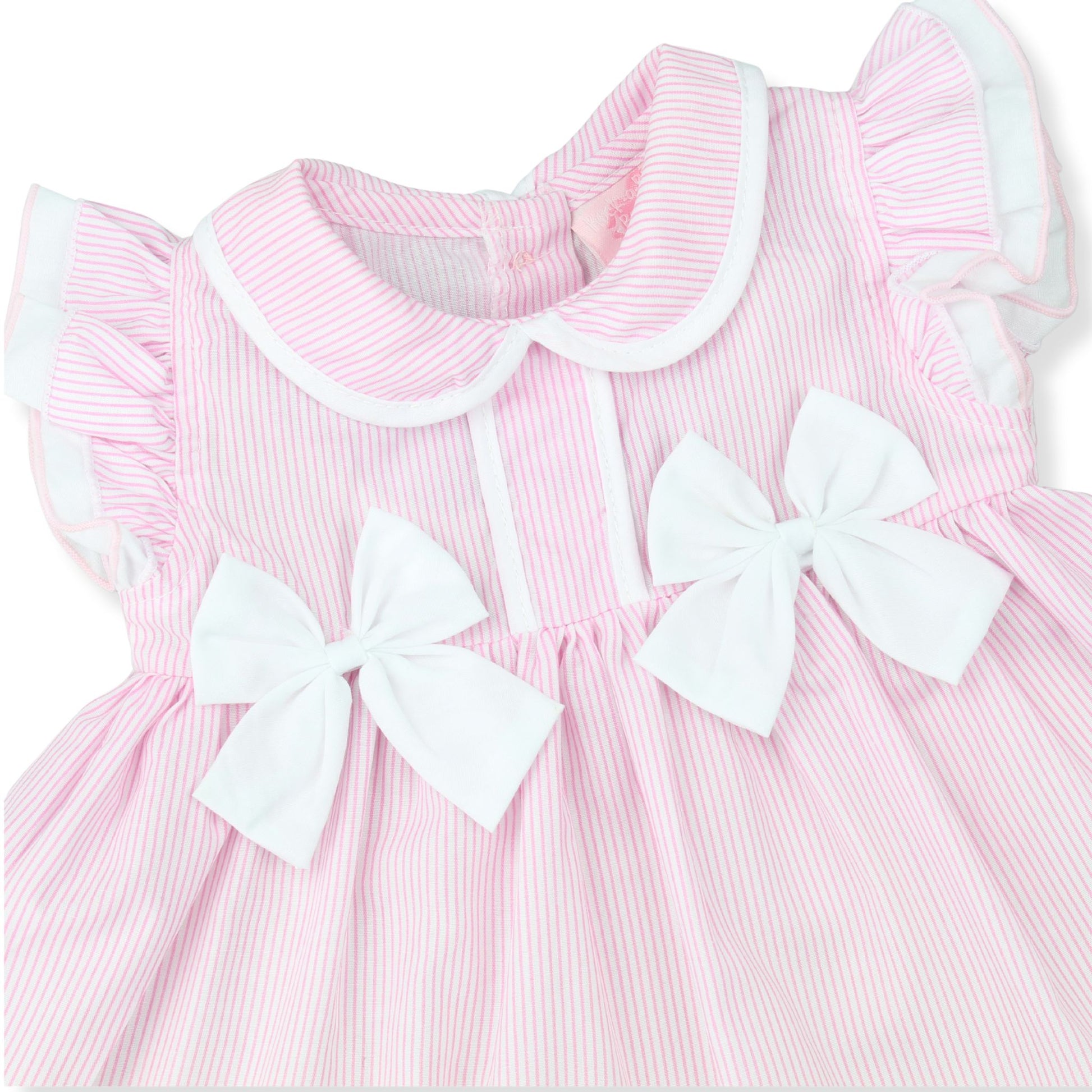 The dress features a sweet Peter Pan collar, delicate frilled sleeves, and white bow detailing at the waist. A soft ruffle hem adds a pretty finishing touch, while the elasticated bloomers provide comfort and ease for everyday wear.