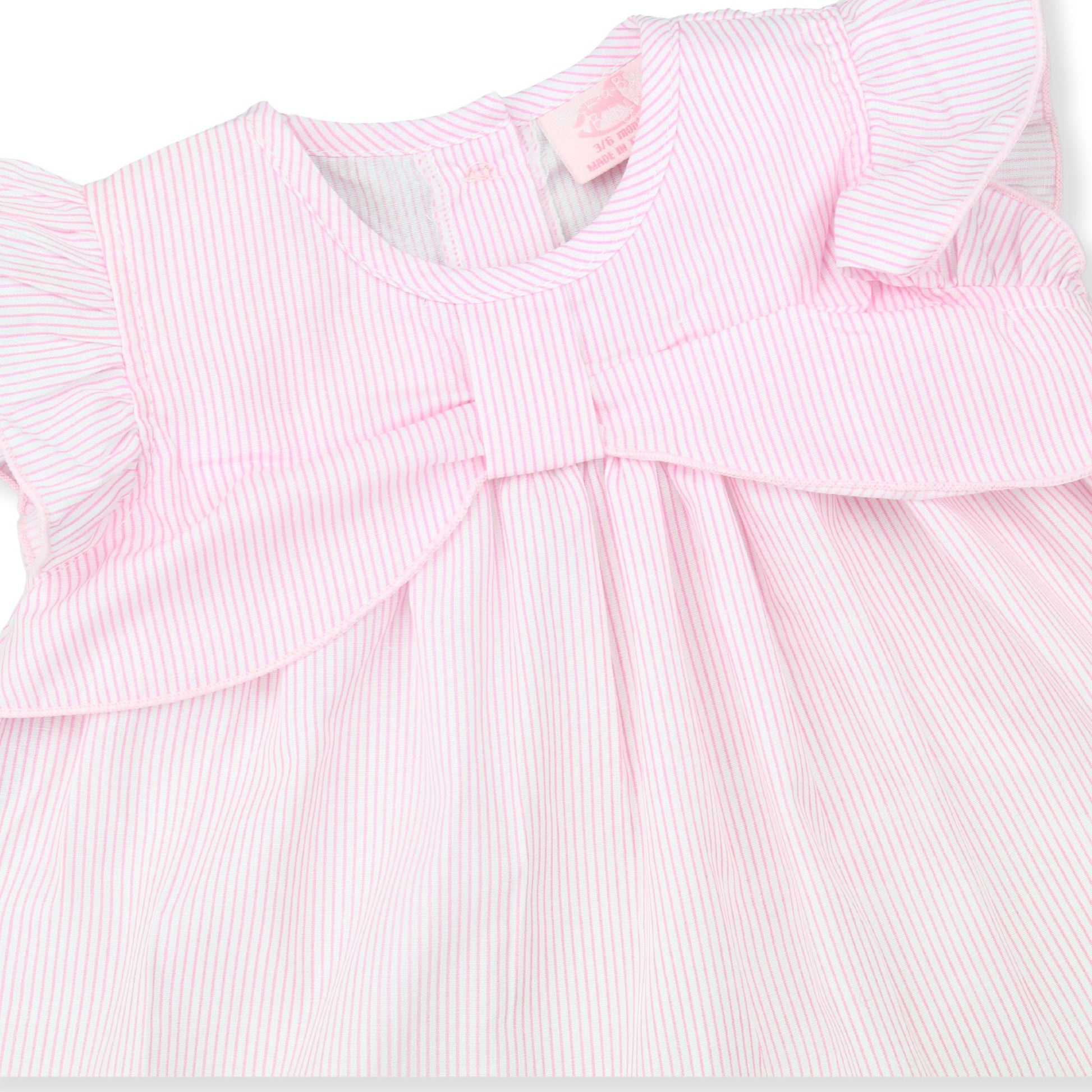 A pretty and affordable three-piece baby girls outfit in soft pink stripes. This sweet set includes a lightweight dress, matching knickers, and a coordinating headband for a complete, easy-to-wear look.