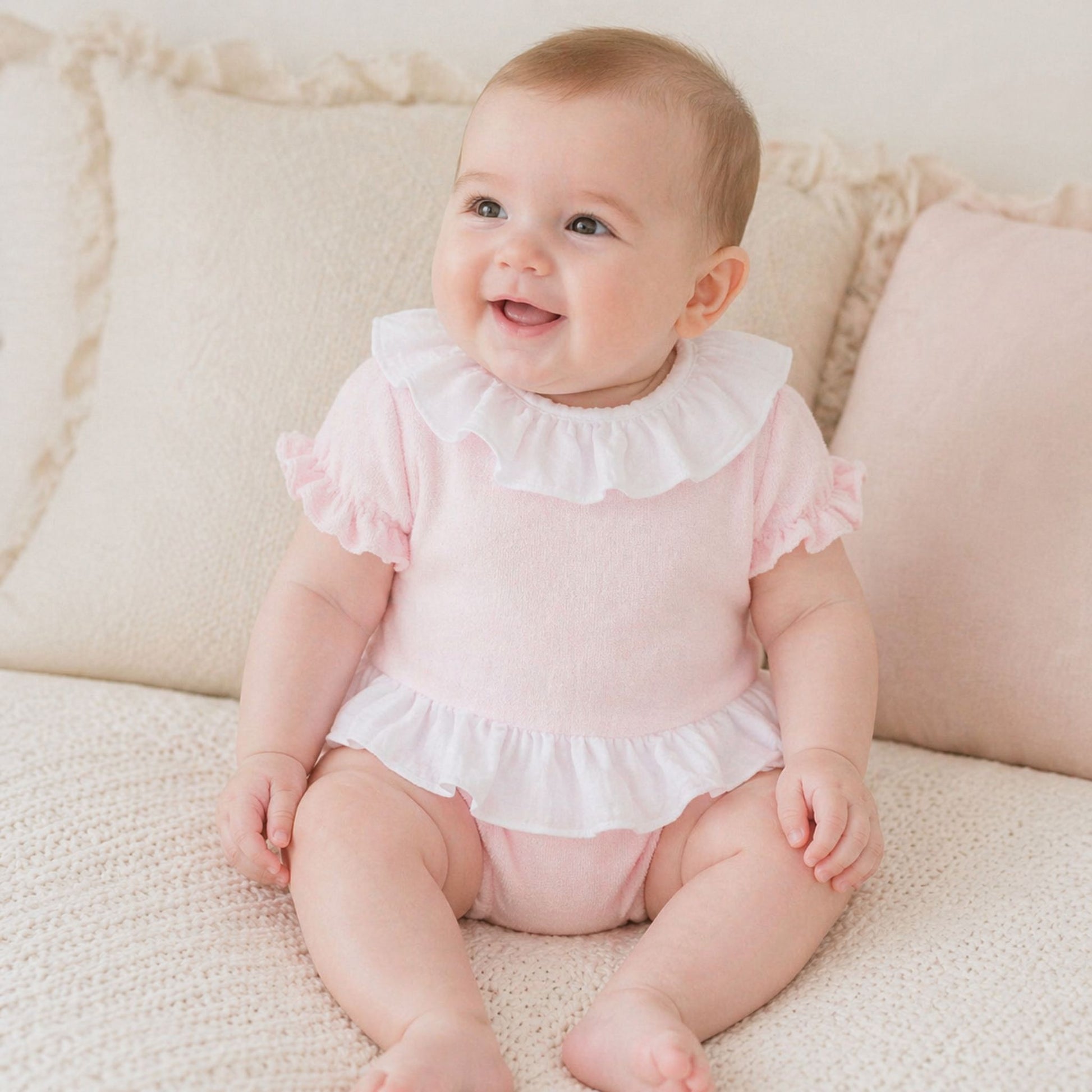 A soft and timeless baby girls pink Spanish romper dress, designed to bring together the look of a dress with the comfort of a romper.