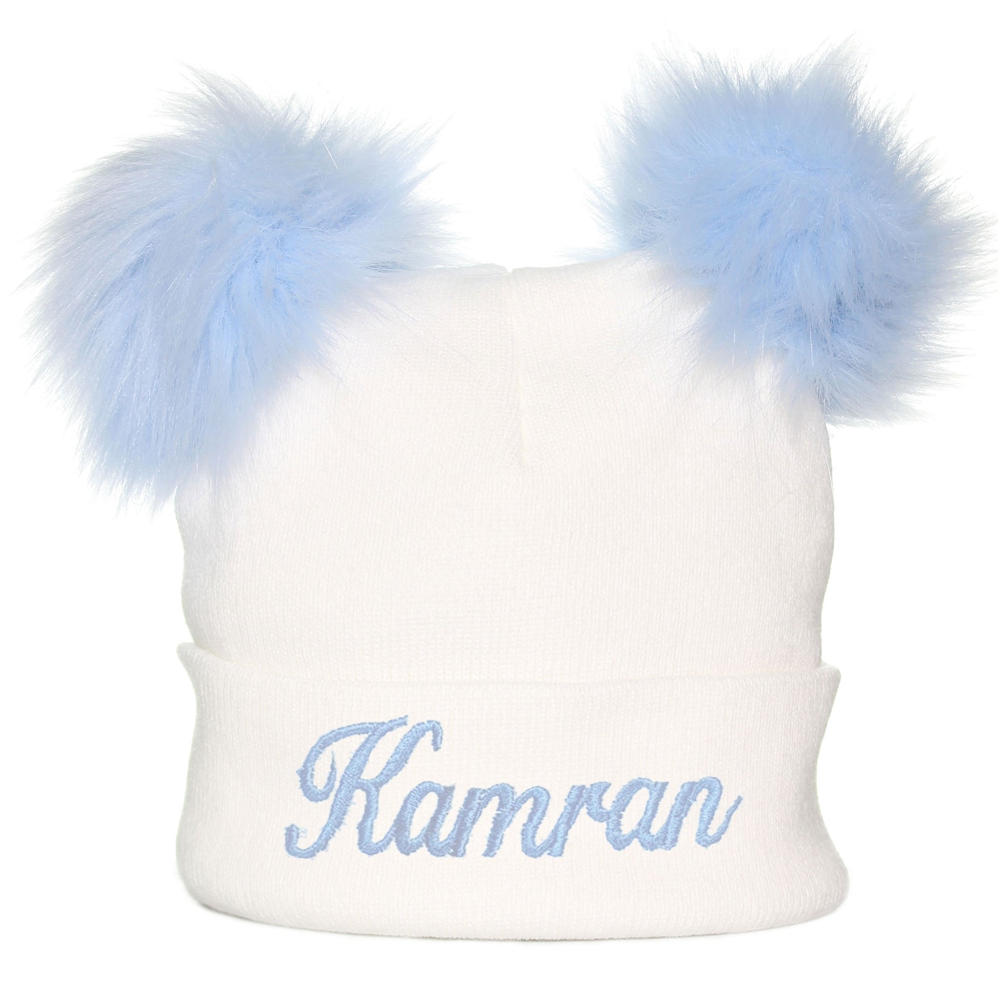 Personalised Pastel White/Blue Double Pom Hat - 1 to 6 years