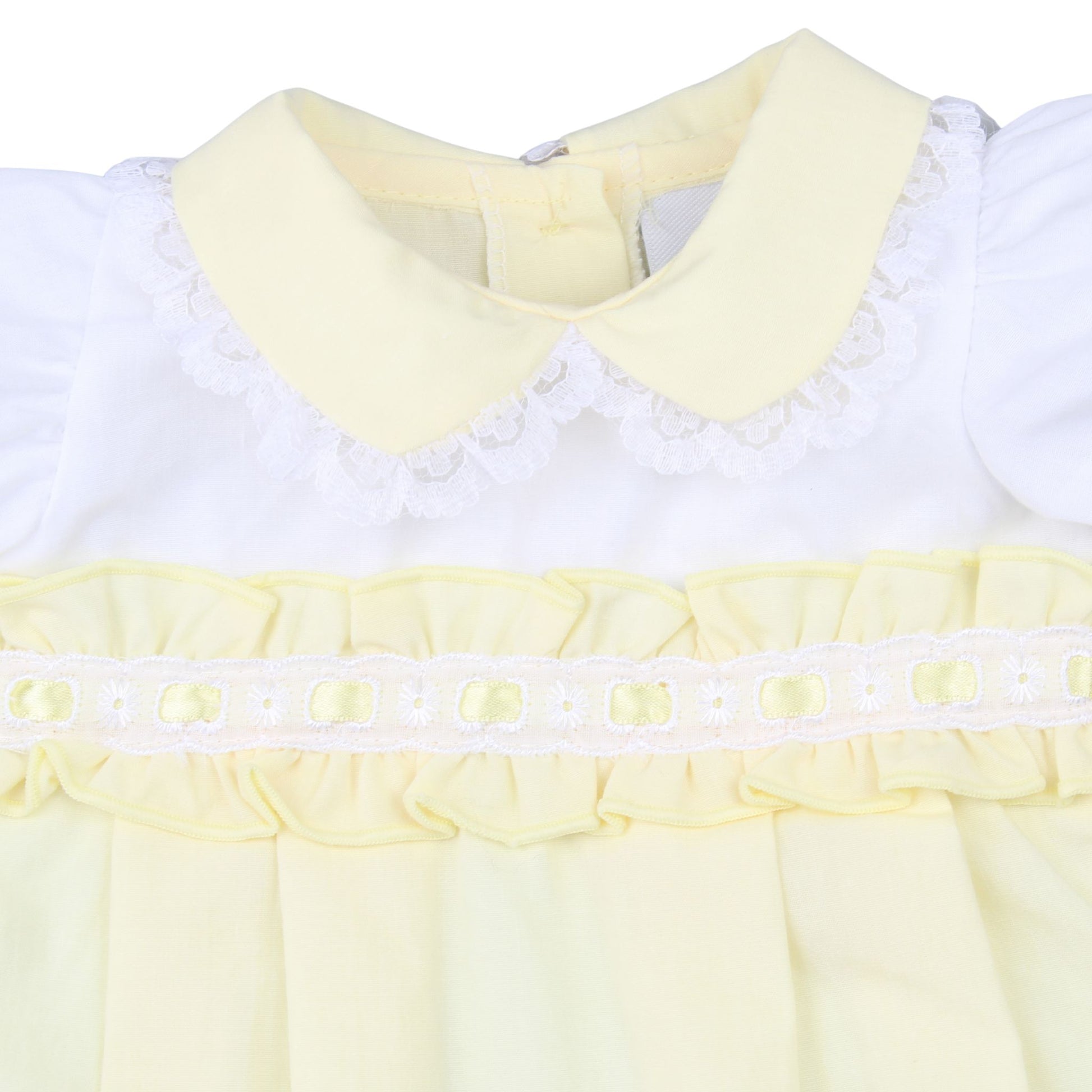 Crafted from a soft cotton blend, it features a white bodice with puffed sleeves, a delicate lace-trimmed Peter Pan collar, and a gently gathered lemon romper bottom. Across the chest, a daisy-style ribbon insert adds a pretty, vintage-inspired touch.