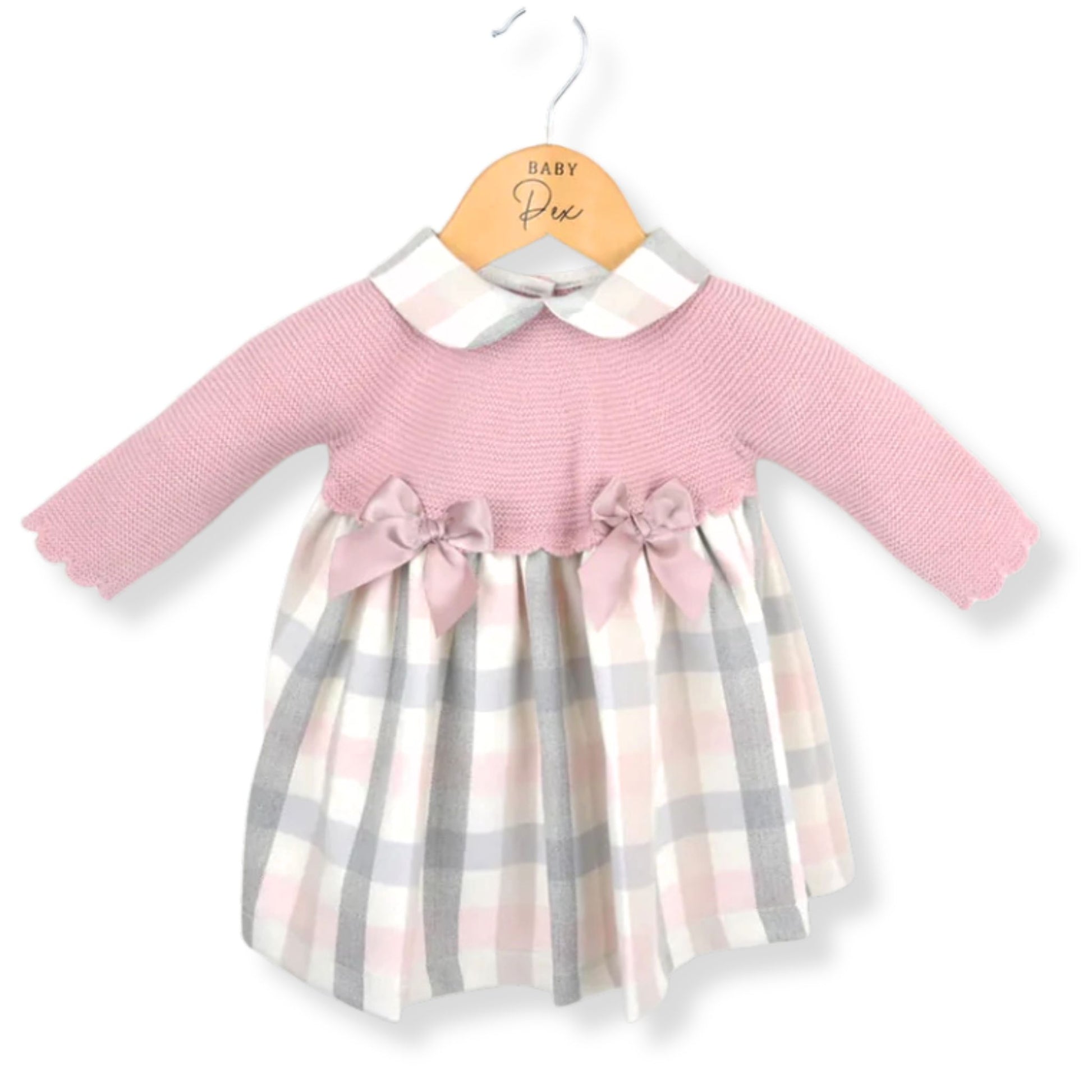 Dusky Pink Knitted Baby Girl Dress with Pastel Check Skirt & Satin Bows – Elegant 2-Piece Look