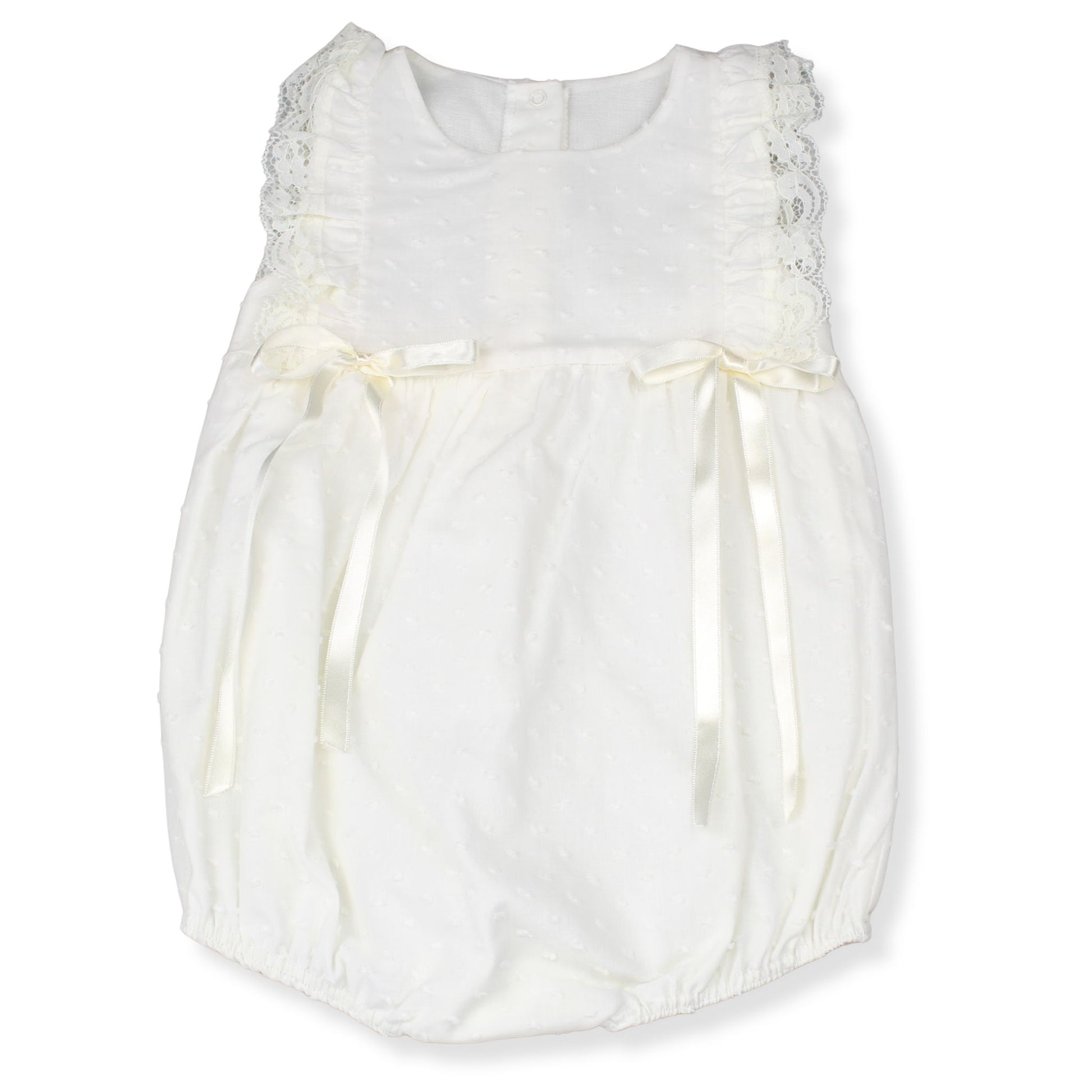 The romper features a soft textured fabric with delicate raised detailing that gives it a refined and classic finish. Lace trims with gentle ruffle detailing run along the shoulders, adding a traditional touch, while two satin ribbon bows at the waist create a charming and elegant look.