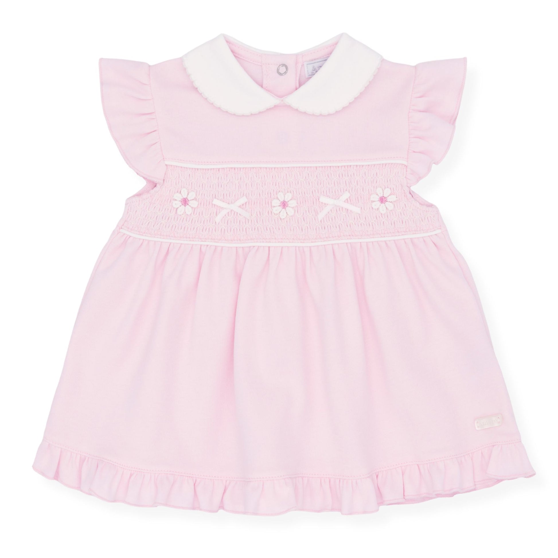 A beautiful pink baby dress from Amore, featuring delicate embroidered daisies and little bows across a smocked chest panel. This sweet design includes flutter frill sleeves, a soft white collar, and a gently gathered skirt finished with a frilled hem.