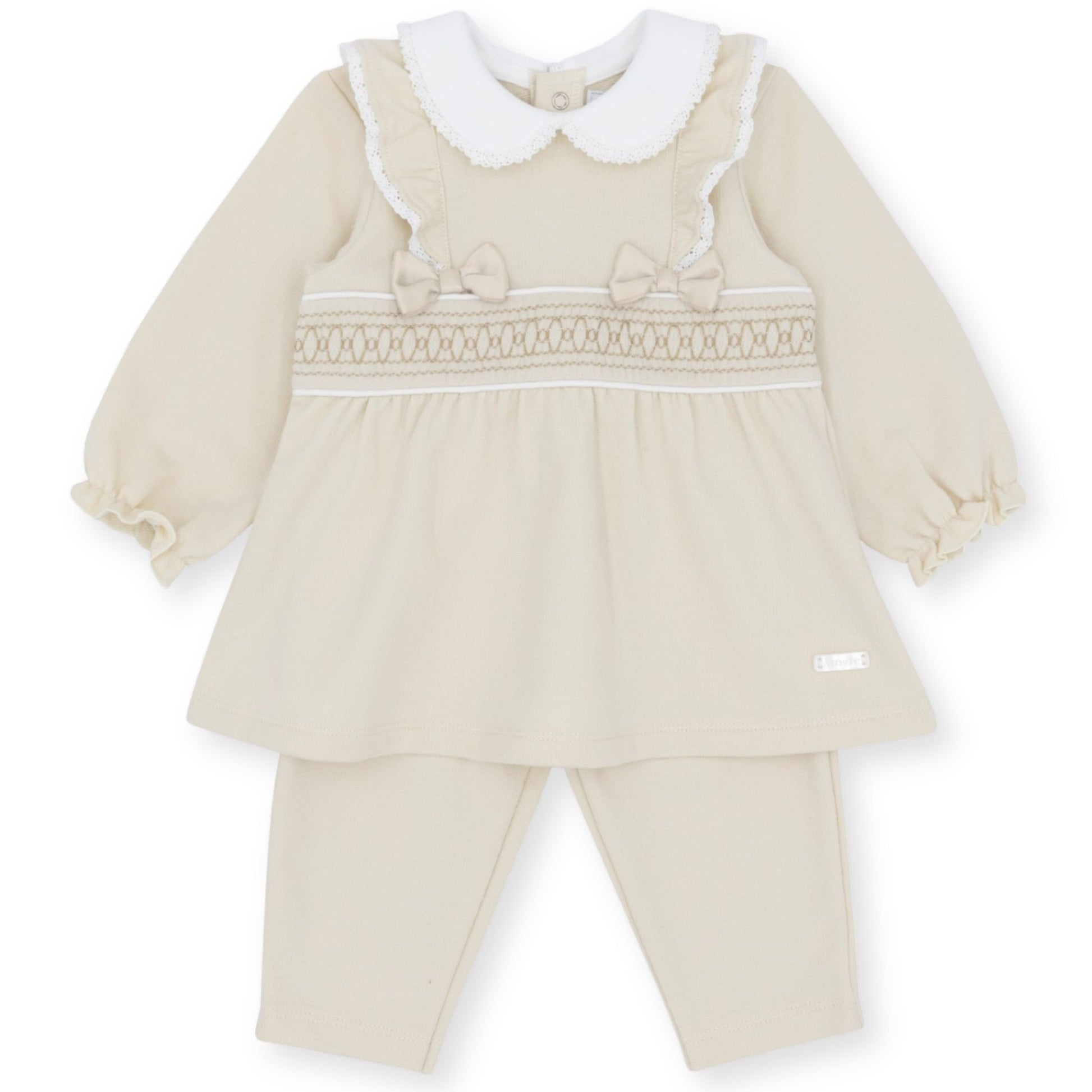 Designed in the UK by Amore, this beige long-sleeve baby dress set blends comfort and classic style. Made from soft, high-quality material, the dress features delicate smocking across the chest, a 2 dainty bow accents, and a white Peter Pan collar edged in lace. Ruffle-trimmed shoulders and gently elasticated cuffs add thoughtful detail, while the matching leggings complete the look. Snap-button fastening at the back ensures easy changes.