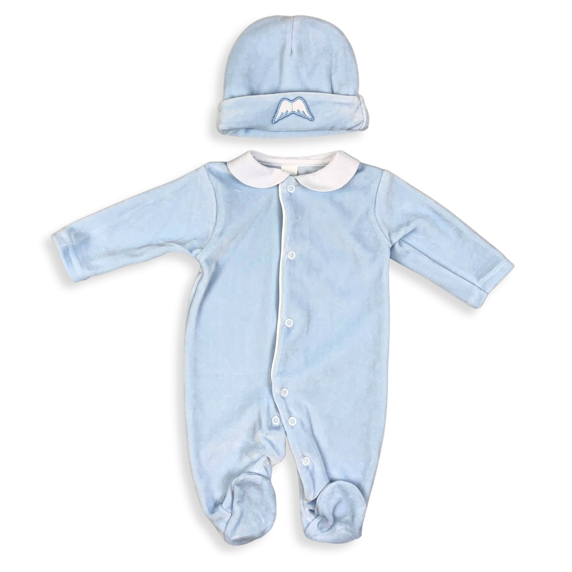 This traditional baby boy velour sleepsuit in blue features cute angel wings to the back of the all in one. To the neck is a smart Peter Pan collar and popper fastening to the front, and between the legs for easy nappy changing. A matching hat completes the outfit with little angel wings to the front.