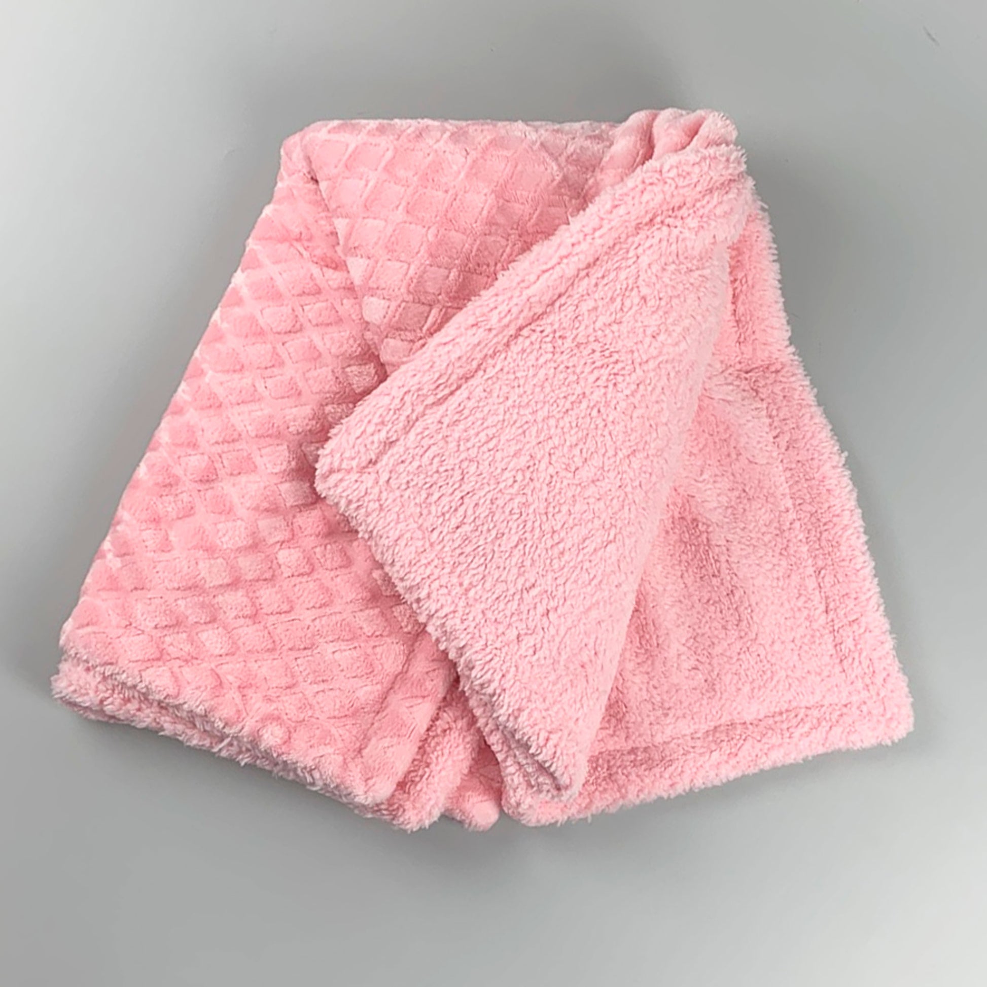 Introducing our Deluxe Pink Baby Blanket, designed to offer the perfect combination of comfort, warmth, and style for your little one. This luxurious blanket features a soft, diamond texture on the top side, providing a gentle and soothing touch that your baby will love. The underside is lined with plush fleece, ensuring your baby stays warm and cosy, whether you're at home or on the go. It is ideal for use in prams, pushchairs, car seats, and even as a soft layer in the crib, offering versatile use and ultimate comfort for your baby throughout the day.