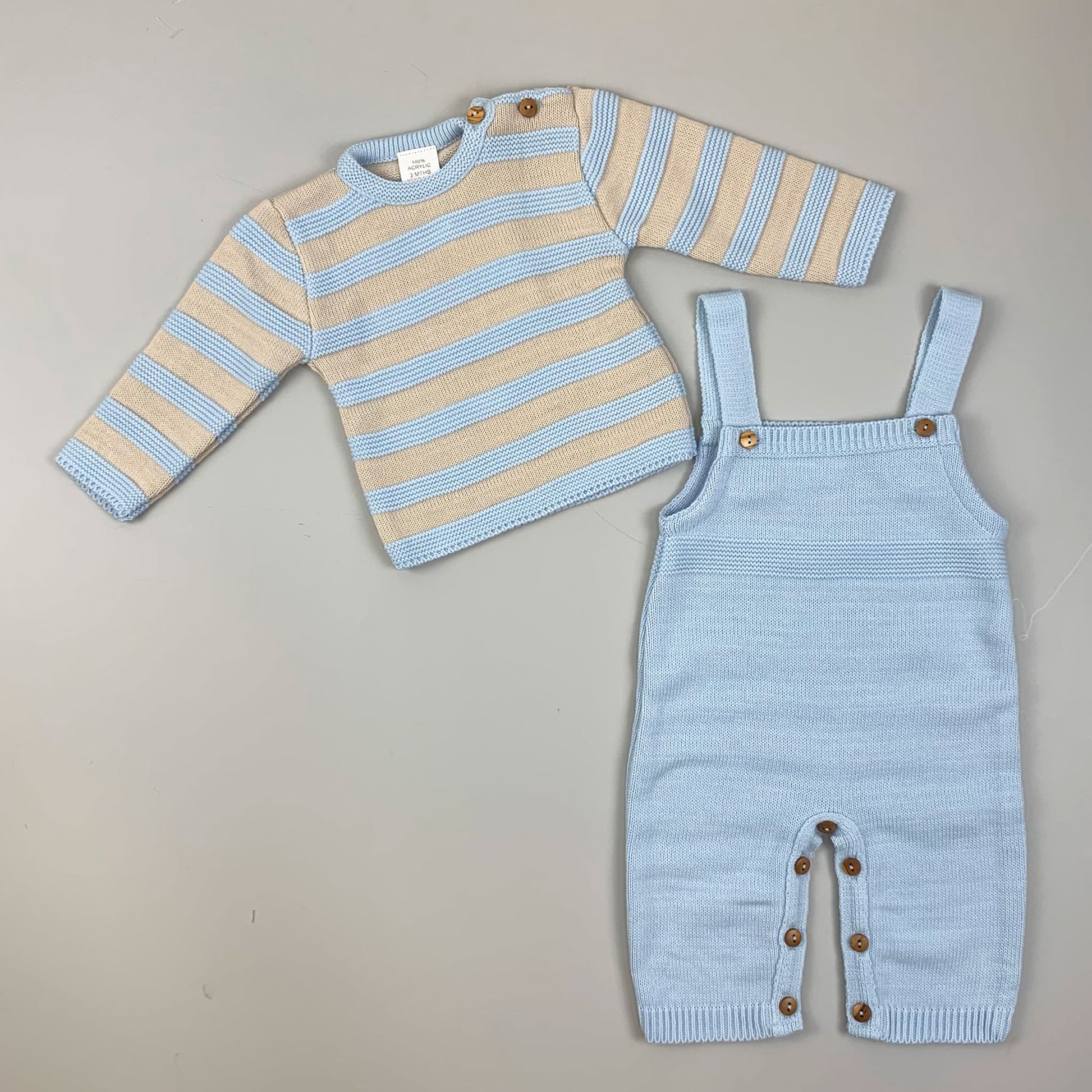 Meet our latest offering - the Baby Dungarees & Knitted Top, now available in a stylish shade of blue! This charming set includes a pair of snug knitted dungarees with wooden button closures and a complementary knitted jumper in beige and blue stripes. Ideal for keeping your precious little one both snug and fashionable this Autumn/Winter. Place your order today and watch your little one steal hearts all around!