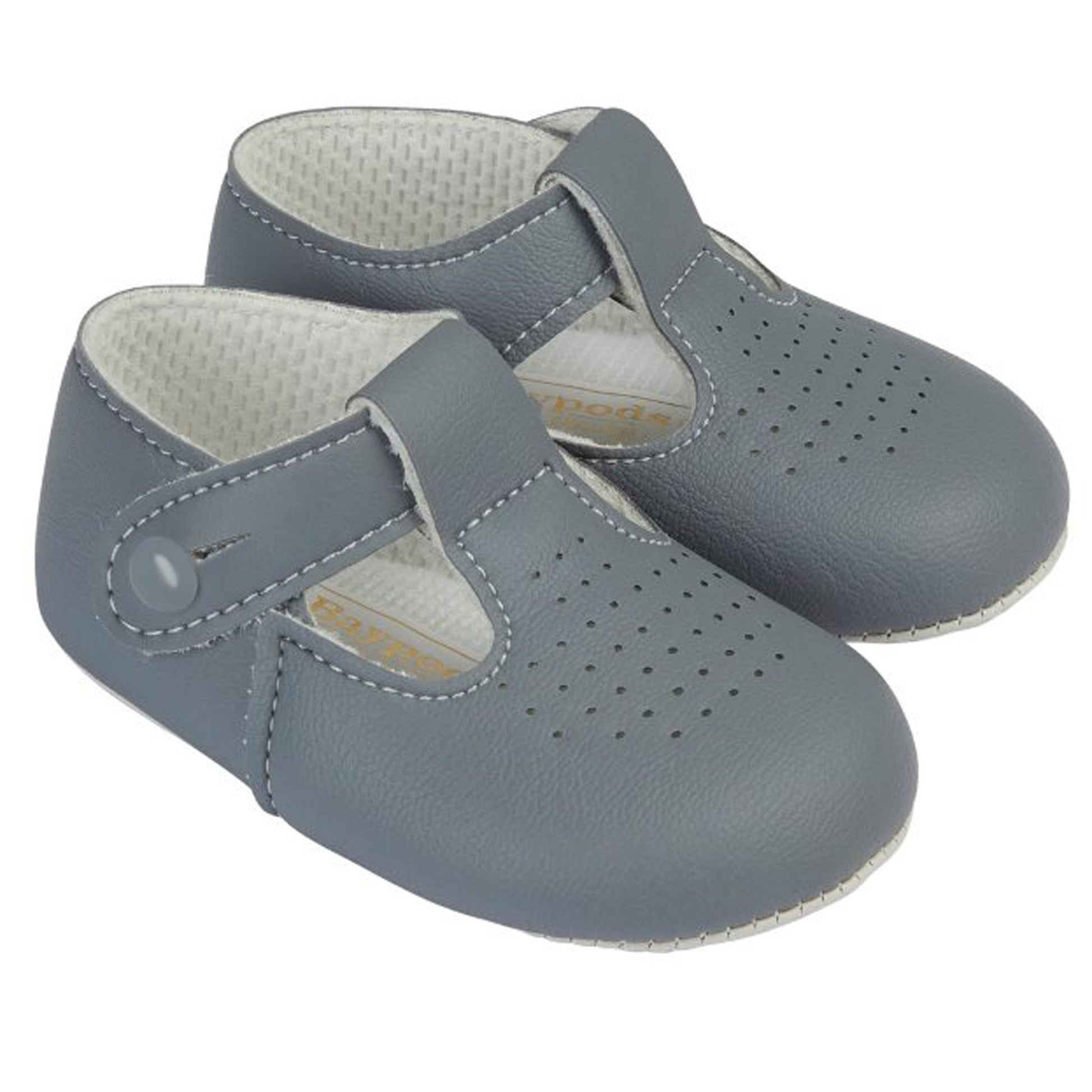 These charming baby boy shoes in a stylish charcoal grey feature a soft sole and a classic T-bar design, making them the ideal choice for babies who are not yet walking or are just starting to take their first steps. The soft sole provides a gentle and flexible fit, allowing your little one to move naturally while ensuring comfort and protection for their delicate feet.