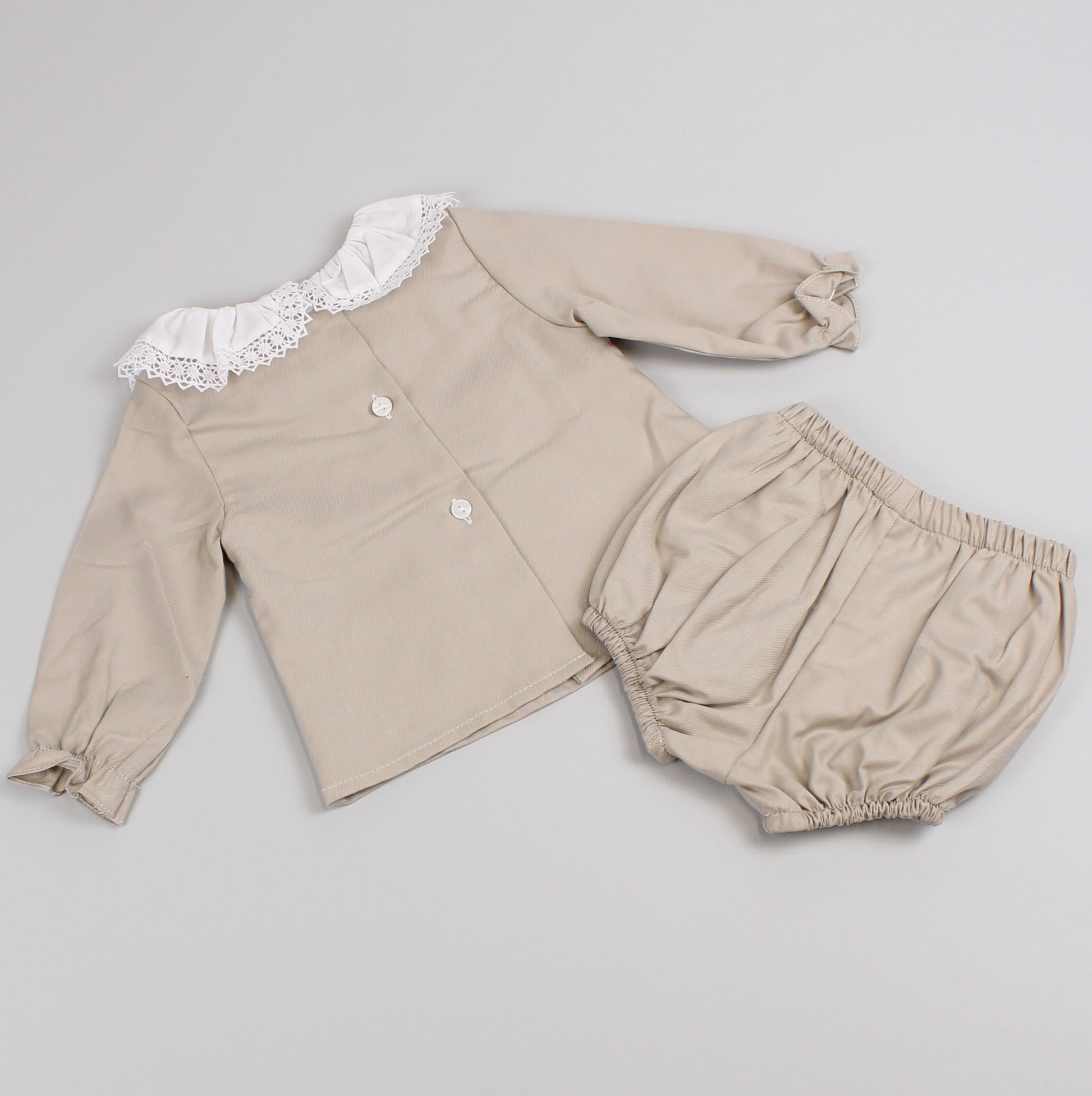 This baby girl's two-piece outfit in beige boasts a classic style and cosy comfort. The long-sleeve shirt features intricate smocking of beige to the front, a beautiful lace collar, and elasticated cuffs. The shirt back buttons up conveniently for effortless changing. The included jam pants also have elasticated leg holes and waistbands to ensure a comfortable fit.