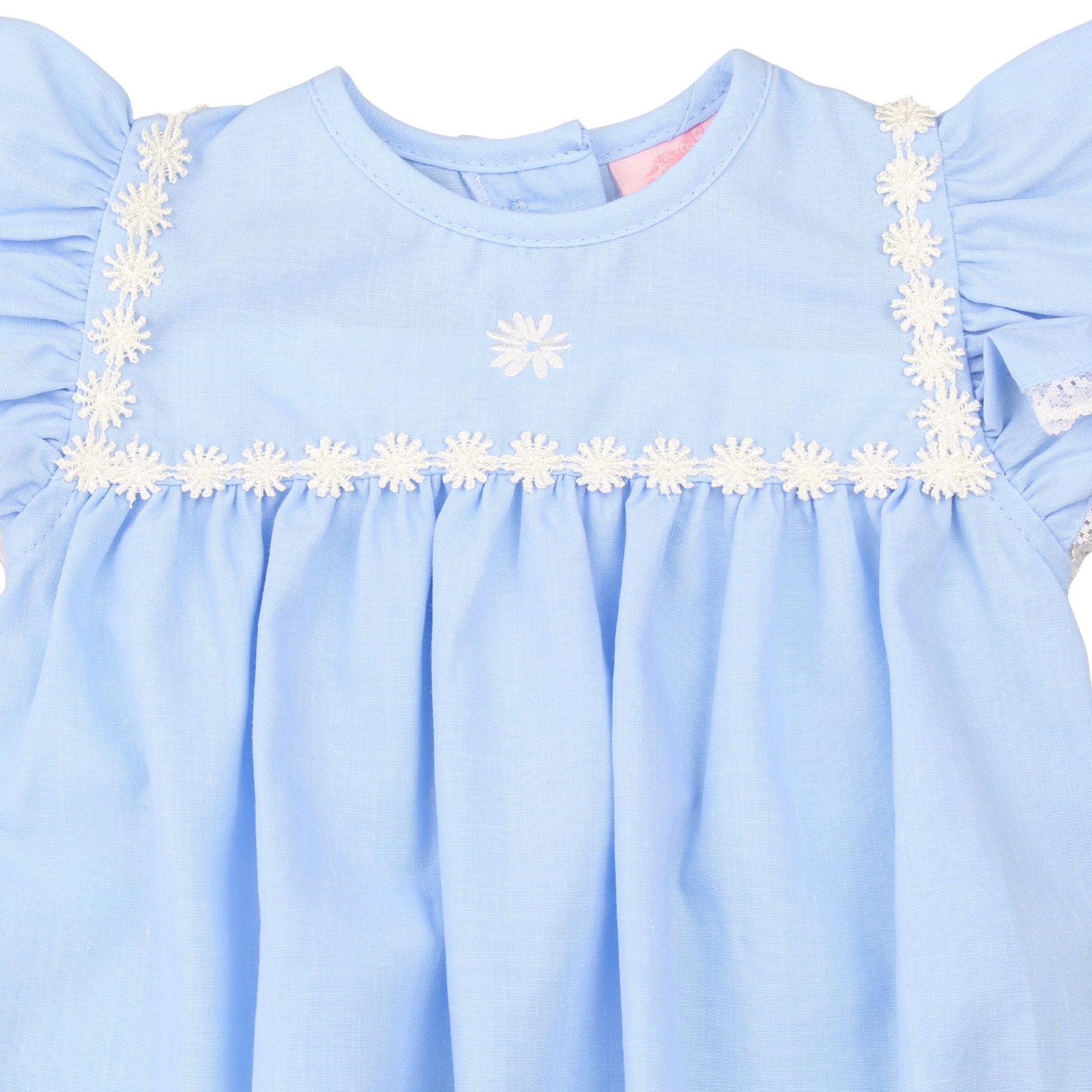 A soft and timeless baby girls romper in a delicate pale pink, designed with comfort and simplicity in mind. This piece features gently frilled sleeves finished with fine lace trim and a subtle embroidered floral detail across the chest for a traditional finish.