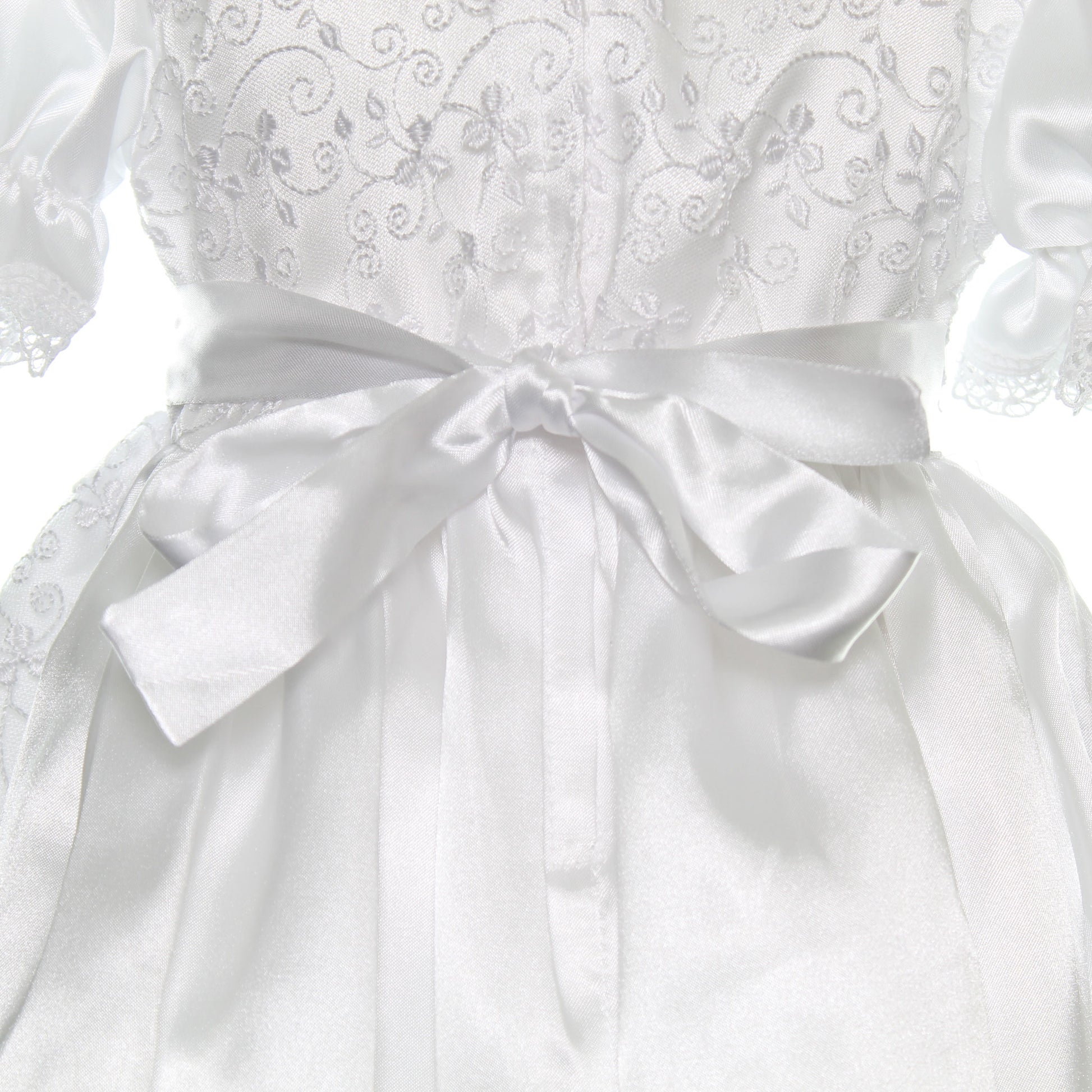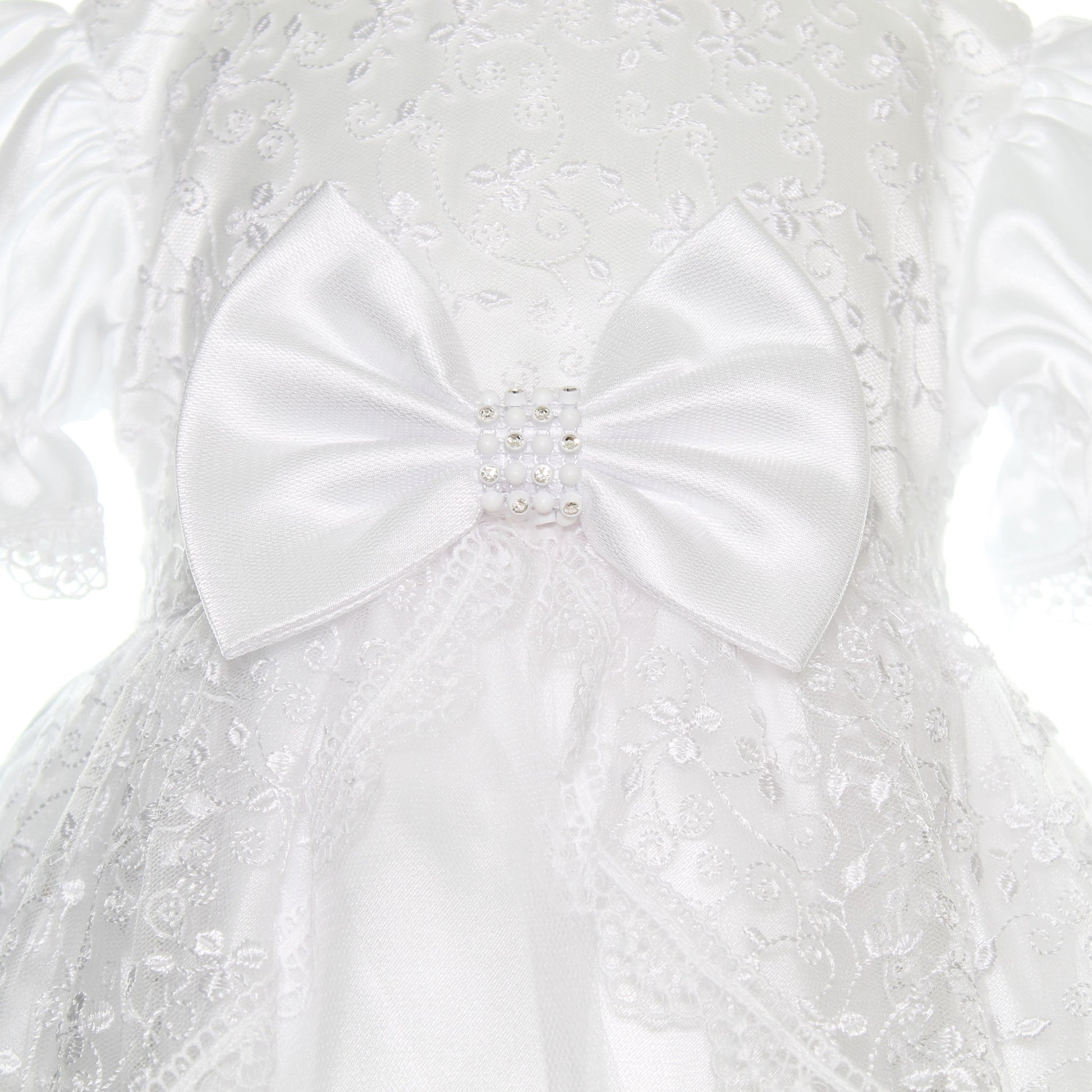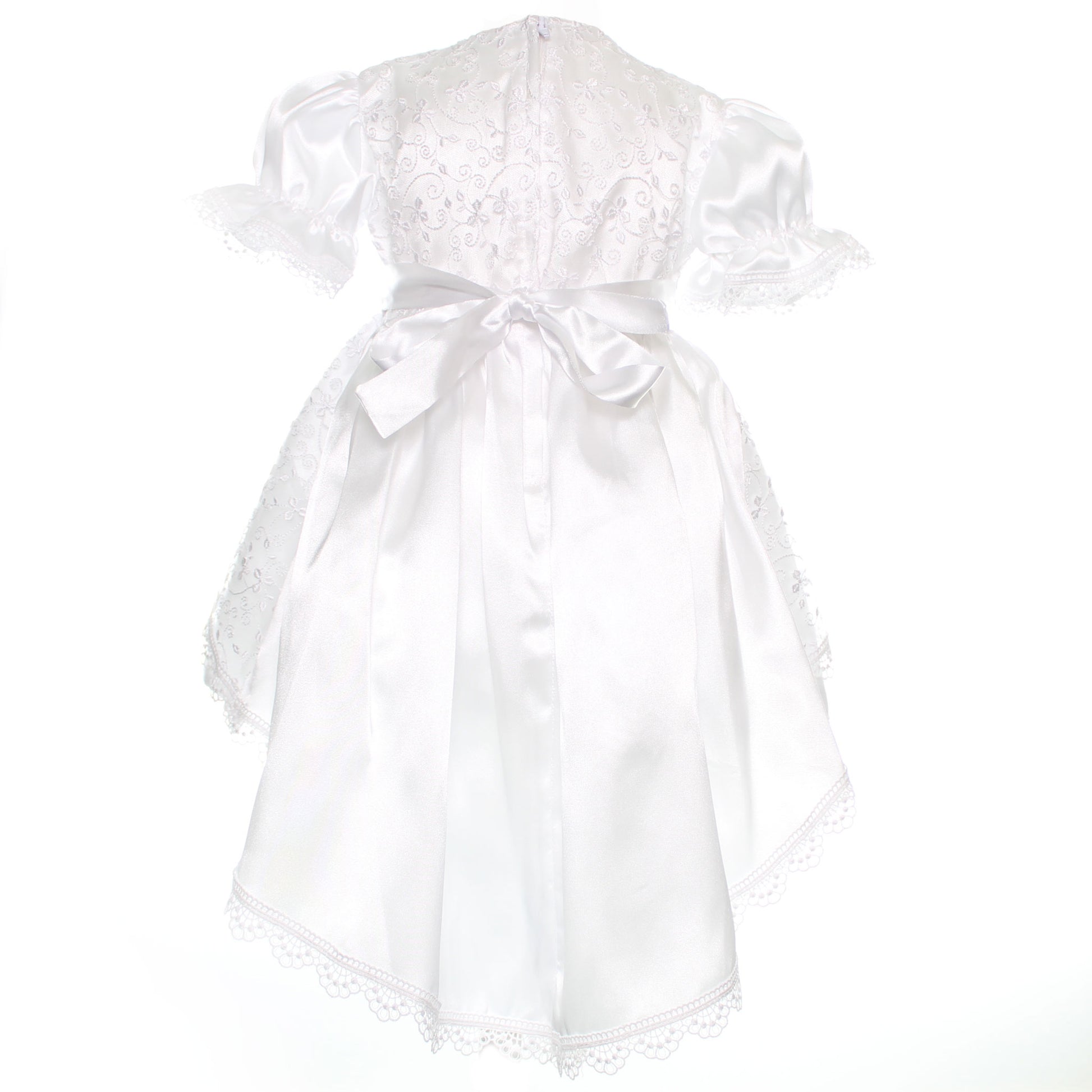 This traditional baby girls white dress is designed with an embroidered bodice and lace overlay. A white satin waist sash with large ribbon bow to the front and a ribbon bow tie to the back. Elasticated satin bloomers with fine lace trim to the leg and a matching headband add a perfect finishing touch. Perfect for a special occasion, this outfit is also ideal for a communion, wedding, bridesmaid, or naming ceremony. A lovely quality, special dress at an affordable price.