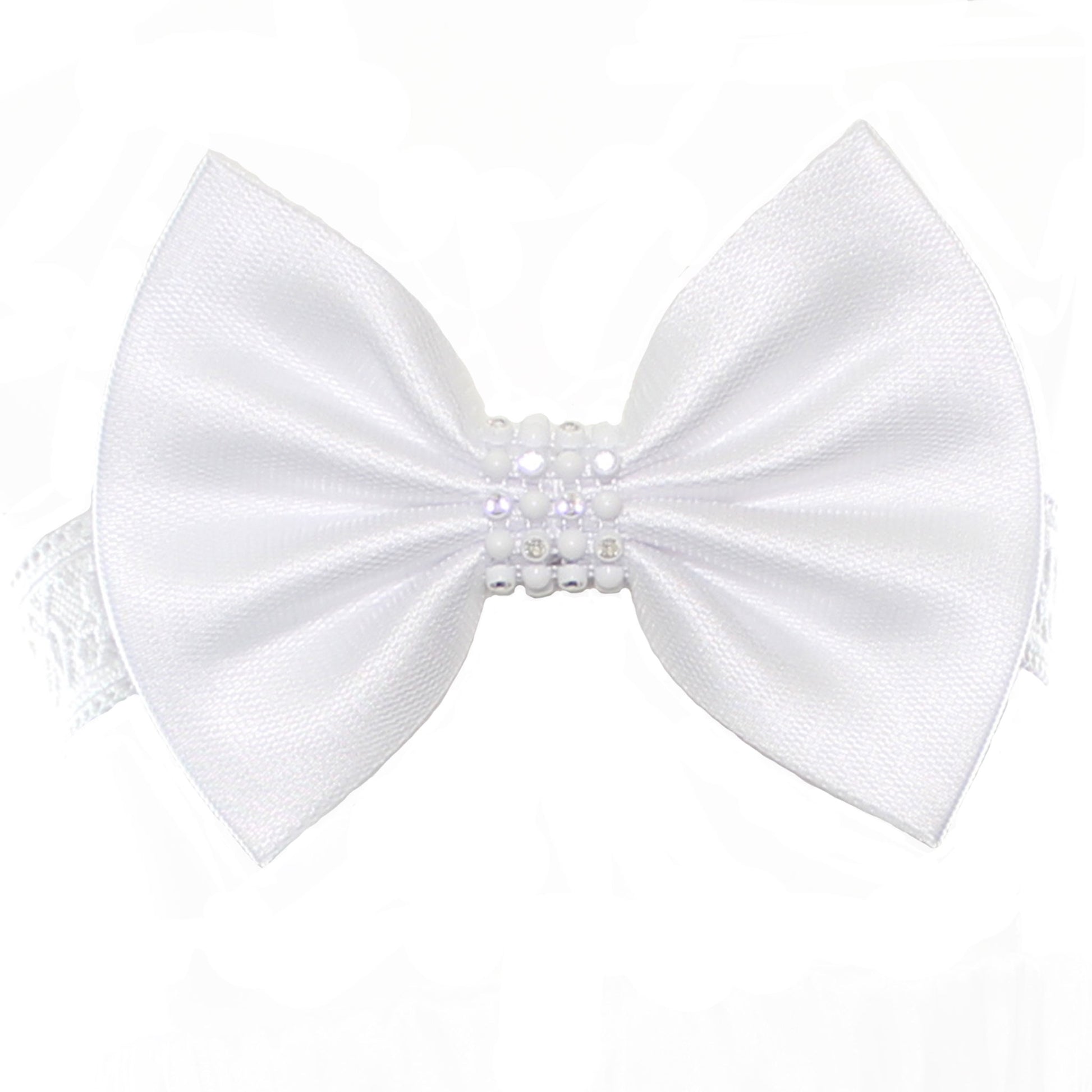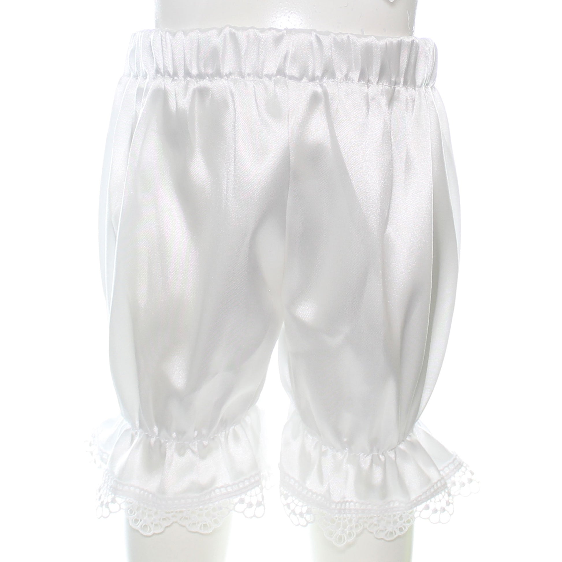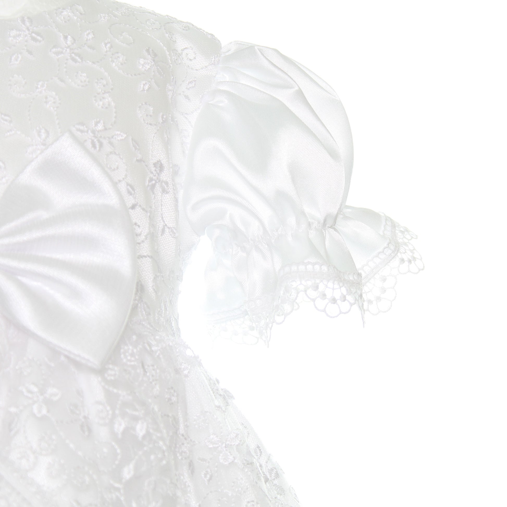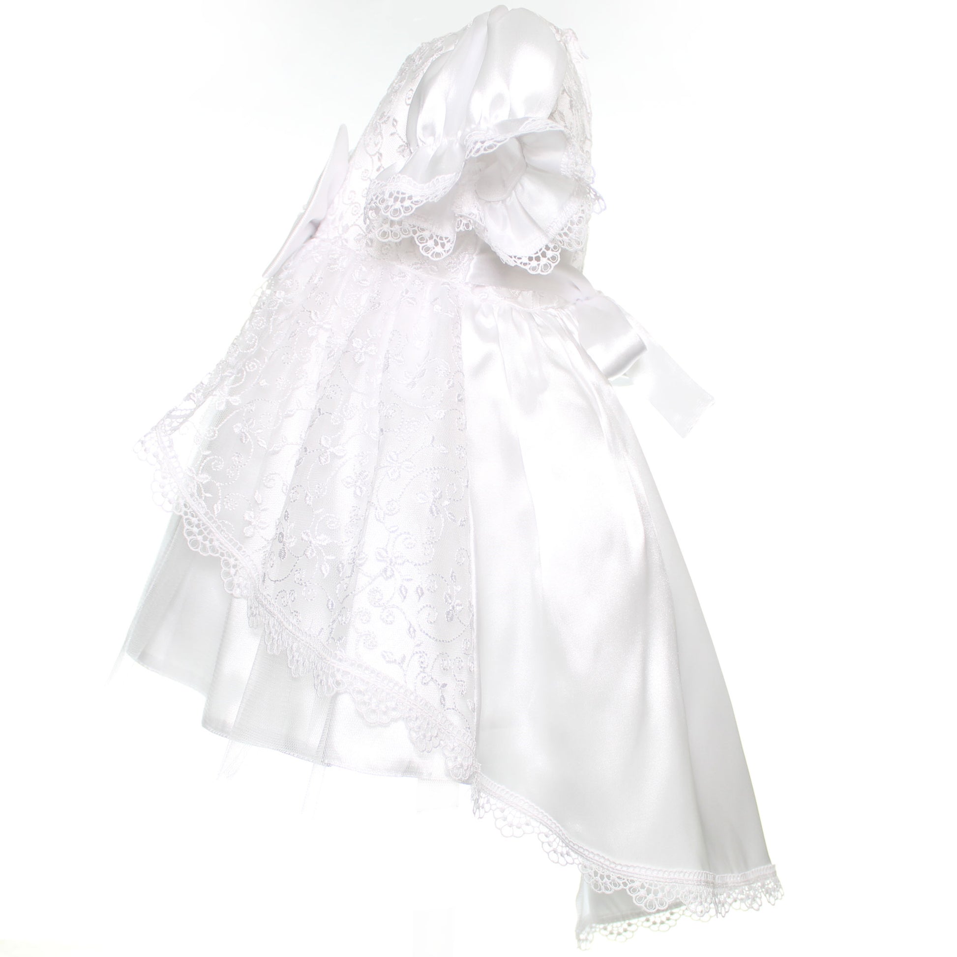 This traditional baby girls white dress is designed with an embroidered bodice and lace overlay. A white satin waist sash with large ribbon bow to the front and a ribbon bow tie to the back. Elasticated satin bloomers with fine lace trim to the leg and a matching headband add a perfect finishing touch. Perfect for a special occasion, this outfit is also ideal for a communion, wedding, bridesmaid, or naming ceremony. A lovely quality, special dress at an affordable price.