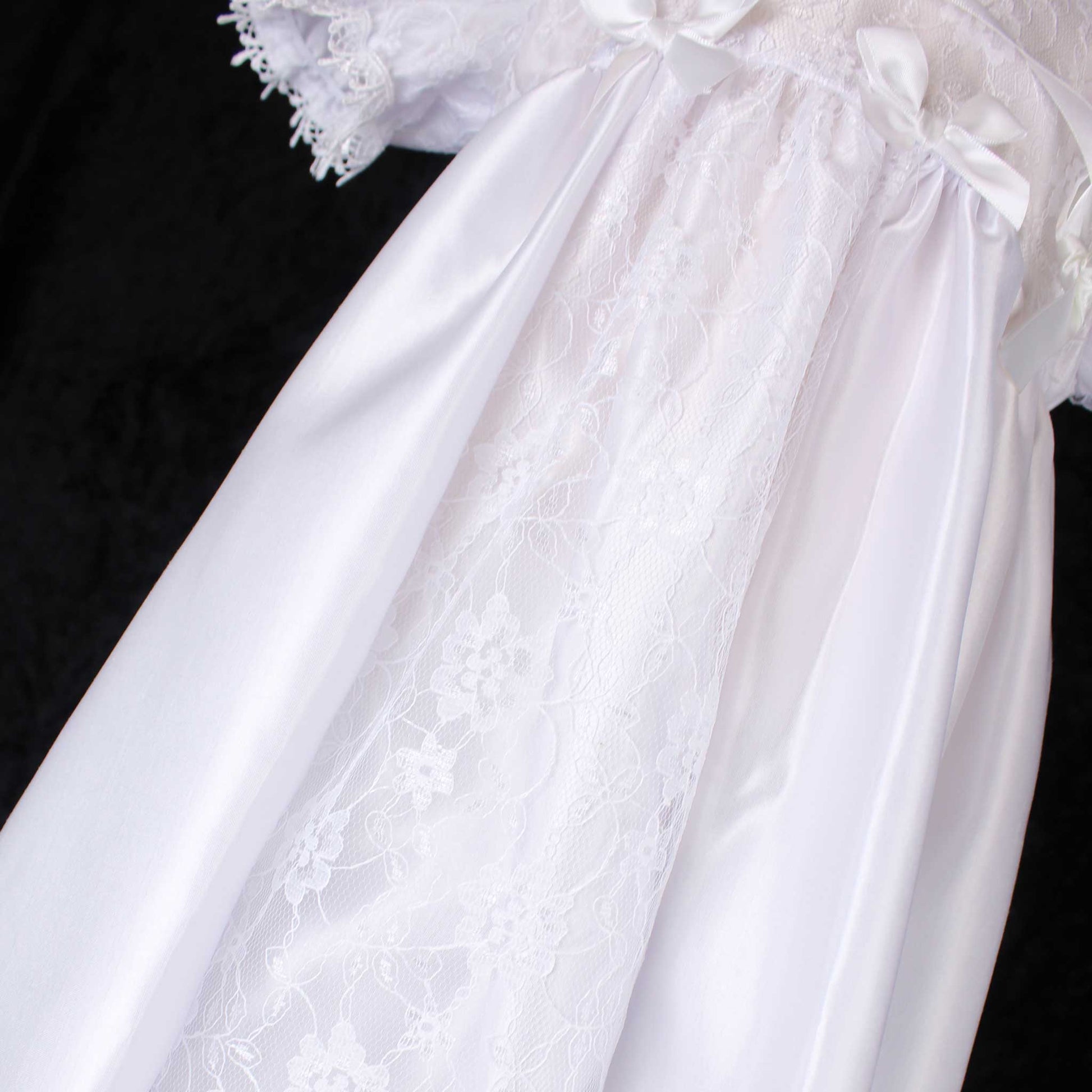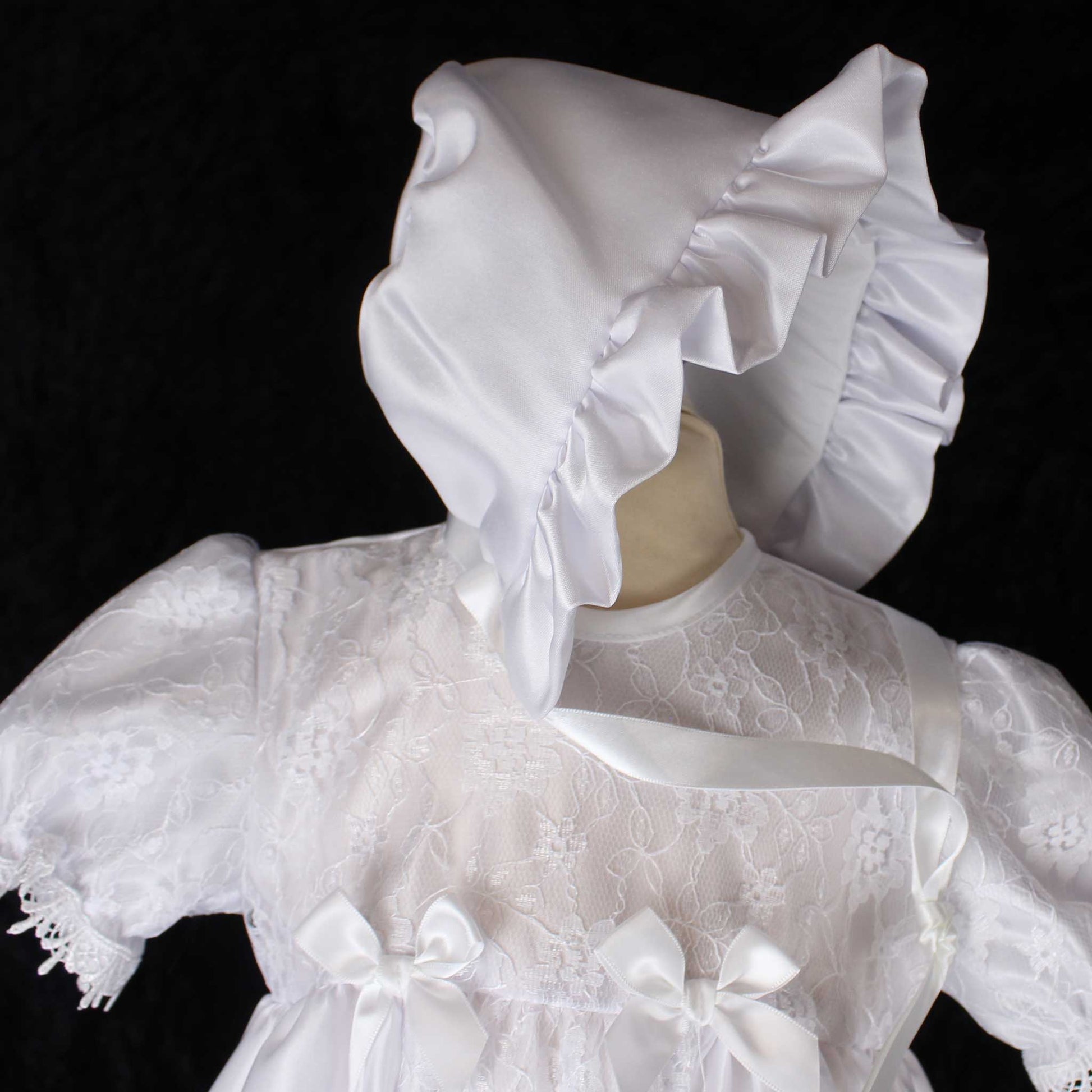 Pex Babywear christening gown with lace detailing on top continuing down the front of the gown, two white bows to the front of the gown, satin like material under the lace and around the gown, satin like bonnet with ribbon to tie under chin.