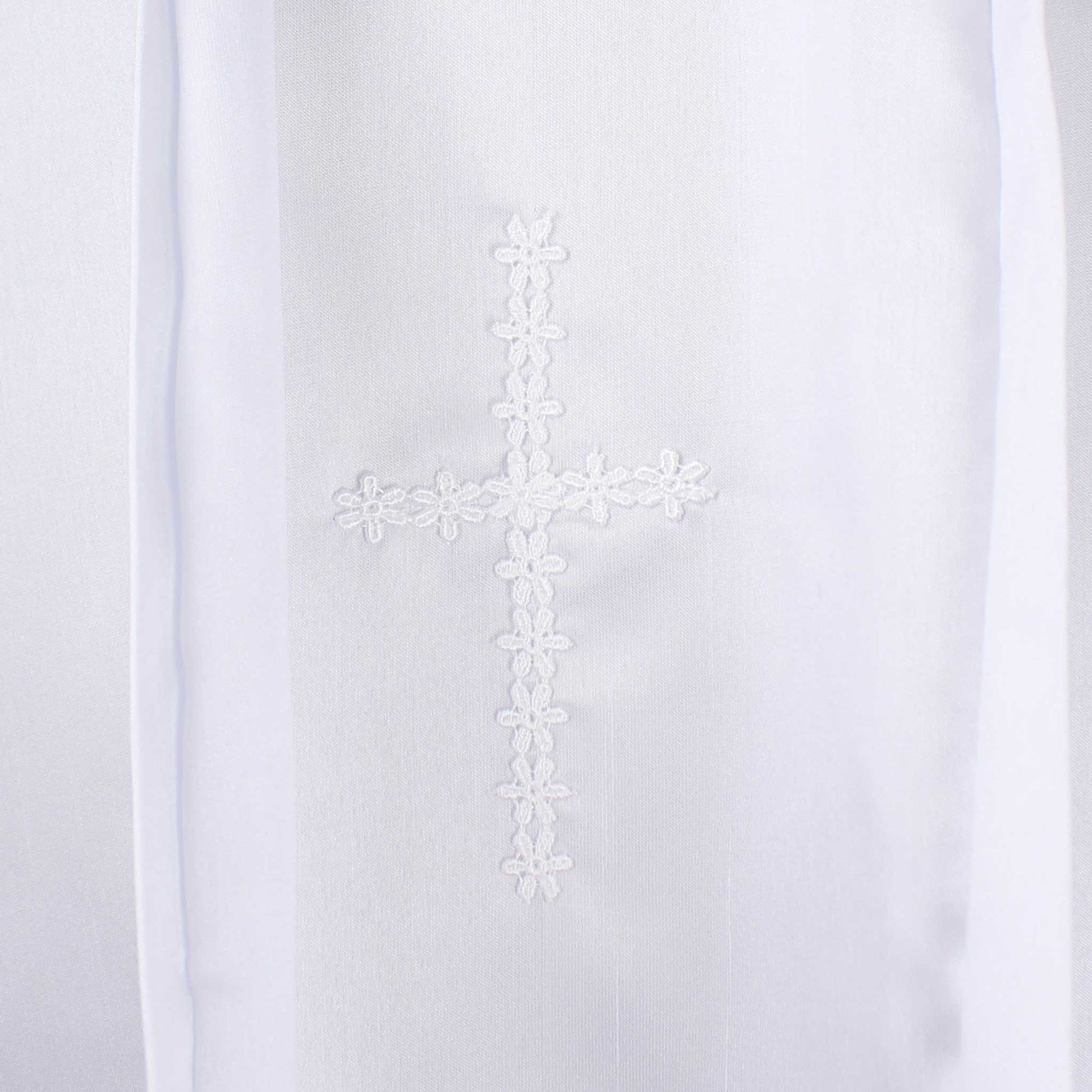 Pex Babywear girls christening robe and bonnet in white, lace detailing on arms and to separate top and bottom, bonnet is a satin like material with ribbon to tie under chin, cross down front of gown made of embroidered flowers.