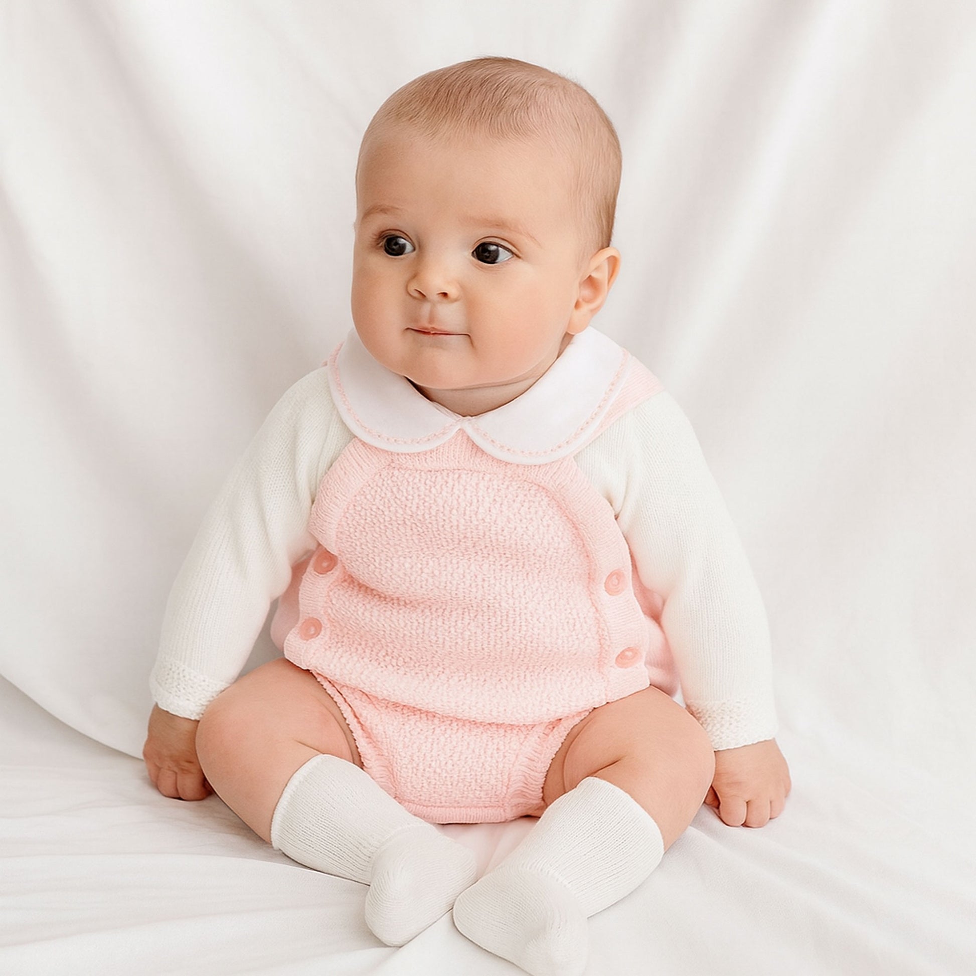 This pink two-piece Little Nosh baby girl outfit includes a knitted romper with braces that cross over at the back and secure at the front with buttons, and a long-sleeved knitted shirt with a Peter Pan collar. Crafted from a high-quality Portuguese knit, the set is available from newborn size up to 18-24 months.