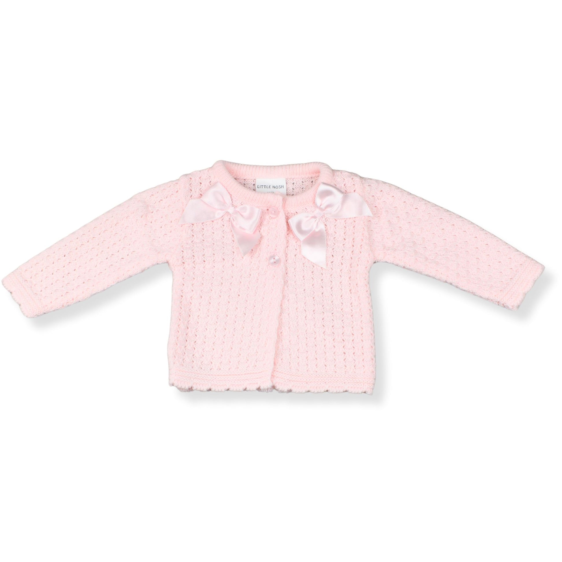This adorable baby girls pink knitted matinee cardigan is perfect for adding a touch of sweetness to your little one’s wardrobe. It features two charming bows at the neck and secure two-button fastening at the top, making it both practical and pretty. The decorative knit pattern adds a lovely texture, making it ideal for layering during cooler days or dressing up for special occasions. Made in Portugal by the quality baby brand Little Nosh, it promises soft comfort and lasting durability for your baby’s everyday adventures. A cosy, stylish essential for your little princess!