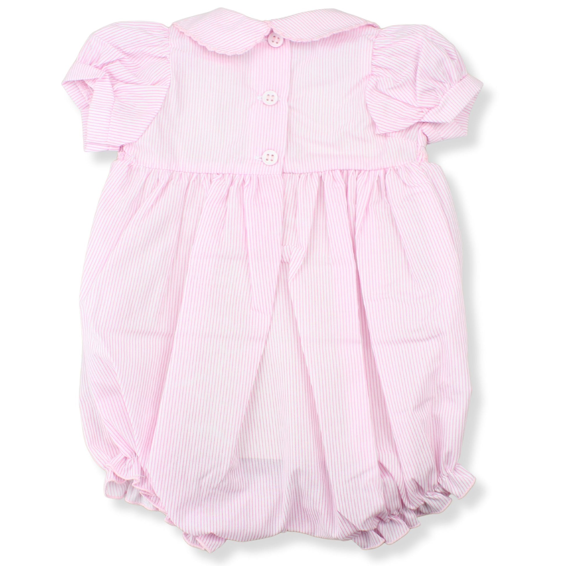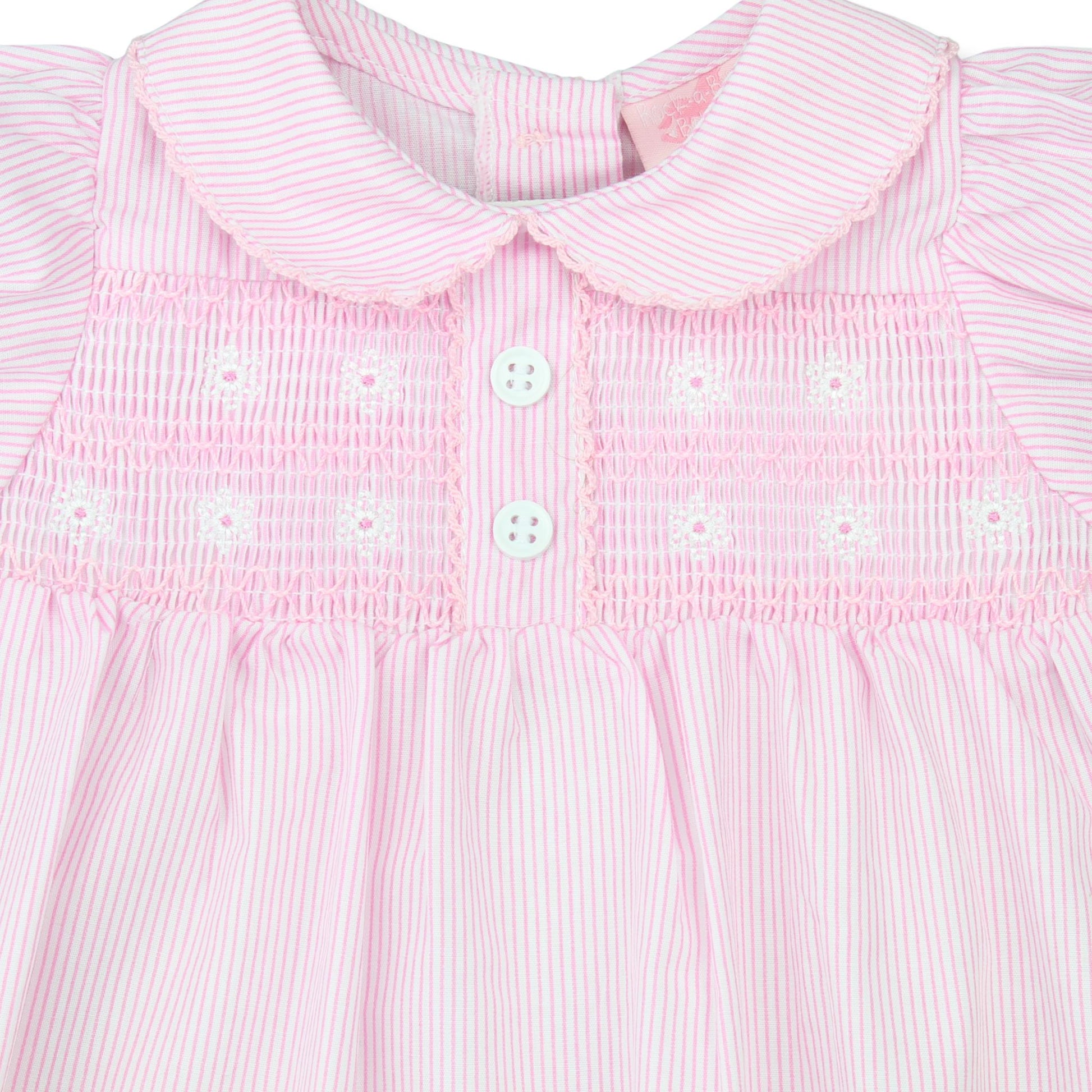 A classic and comfortable baby girls romper in soft pink with fine white pinstripes. This timeless piece features traditional smocking across the chest, delicately embroidered with small floral details, and finished with a sweet Peter Pan collar for a polished look.