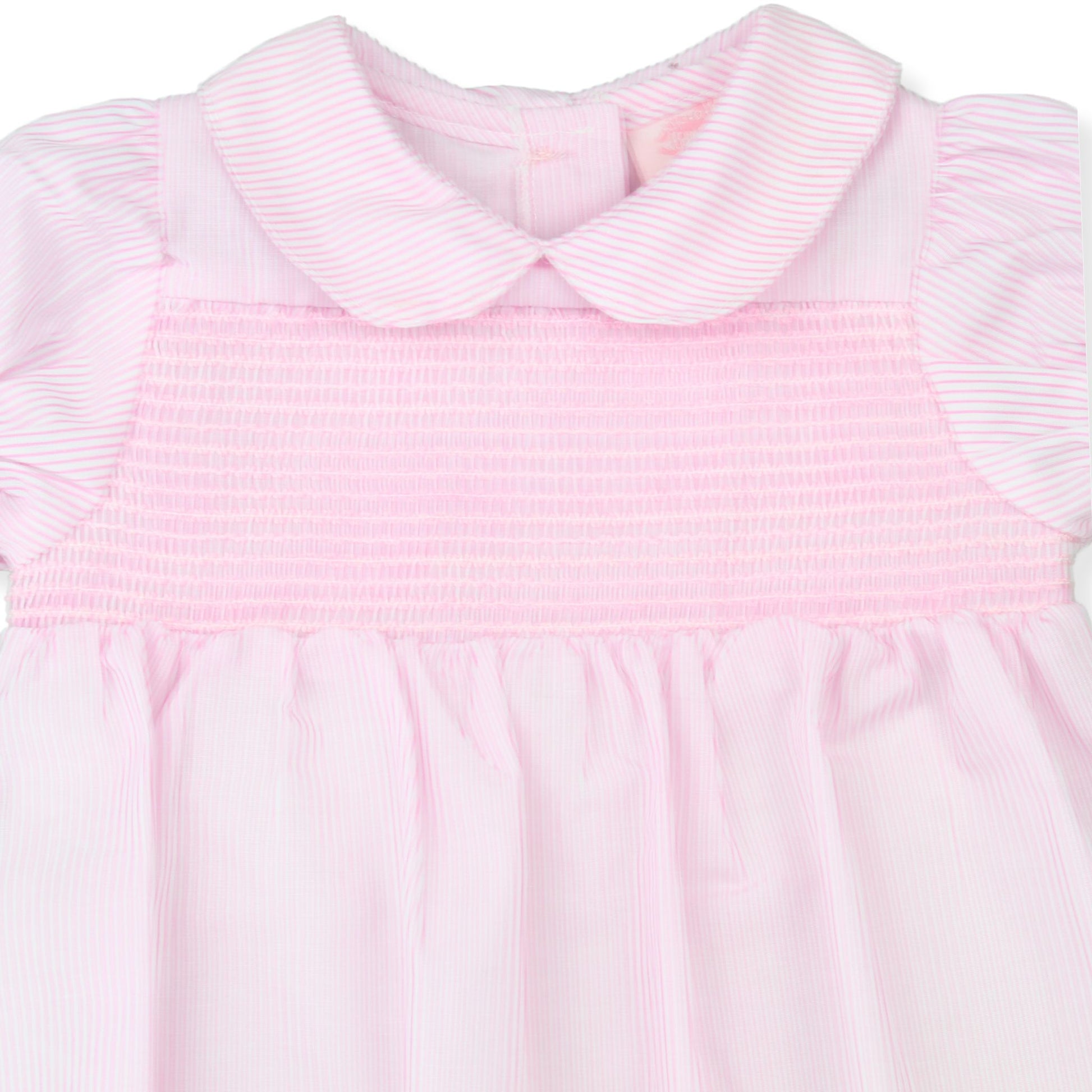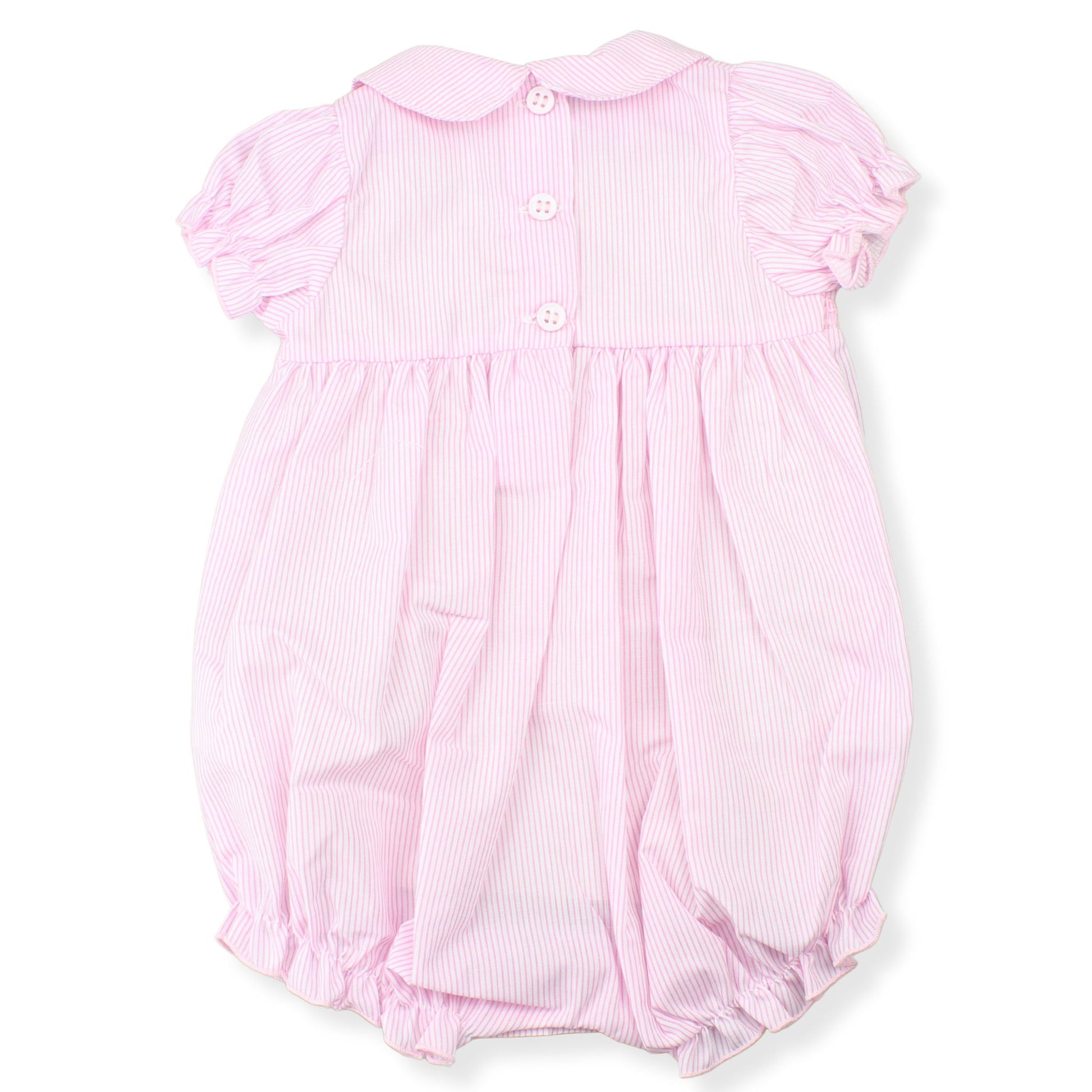 A sweet and lightweight baby girls romper in soft yellow and white stripes, designed for comfort and easy everyday wear. This classic bubble-style romper features delicate smocking across the chest, a traditional Peter Pan collar, and gently puffed sleeves for a timeless look.