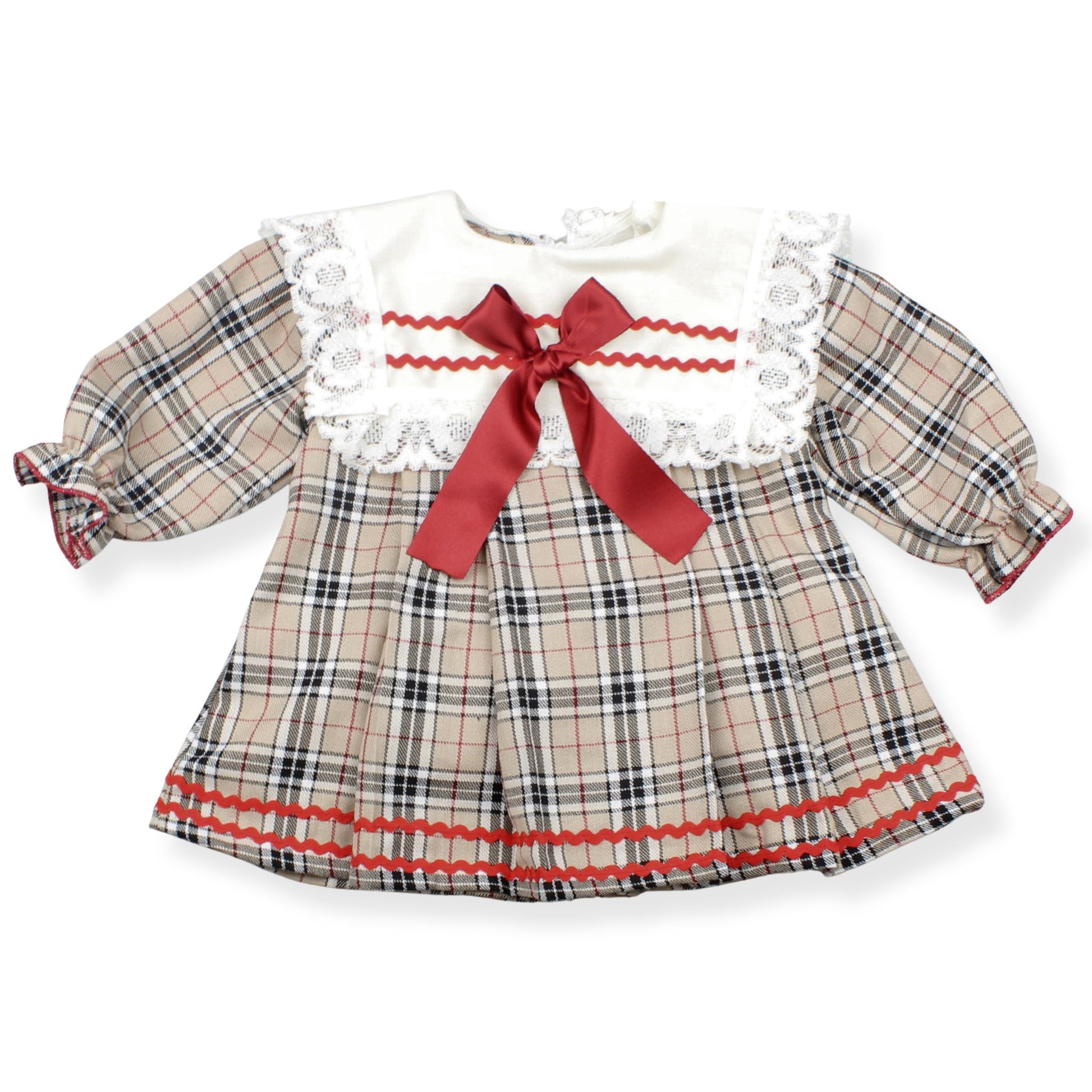 A stunning tartan dress for baby girls, perfect for the festive season or special occasions. This traditional style dress features a beige, black, and red check pattern with a crisp white lace-trimmed collar and a satin red bow to the front. The long puff sleeves are finished with matching trims, while the skirt is decorated with coordinating red ribbon detail.