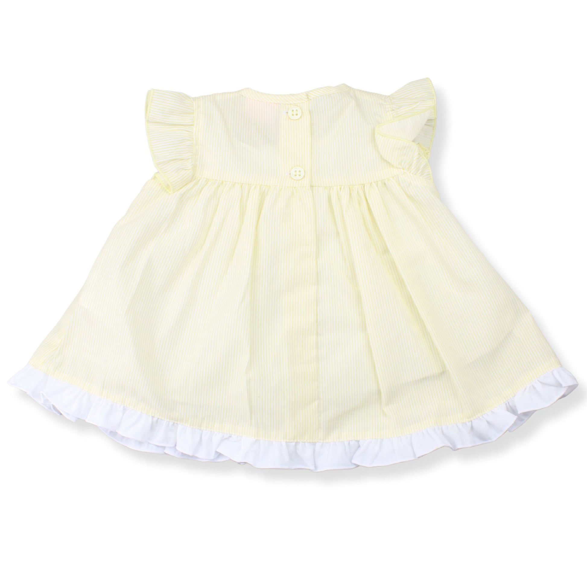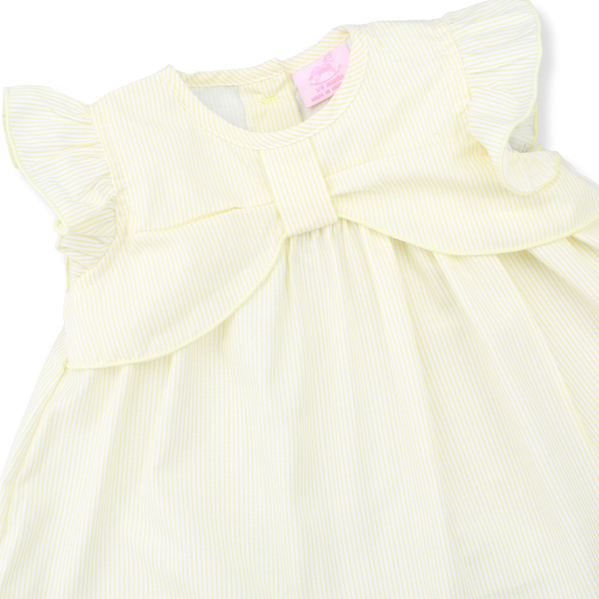 A soft and cheerful three-piece baby girls outfit in pale yellow and white stripes. This sweet set includes a lightweight dress, matching knickers, and a coordinating headband, making it an easy all-in-one outfit for everyday wear or special moments.