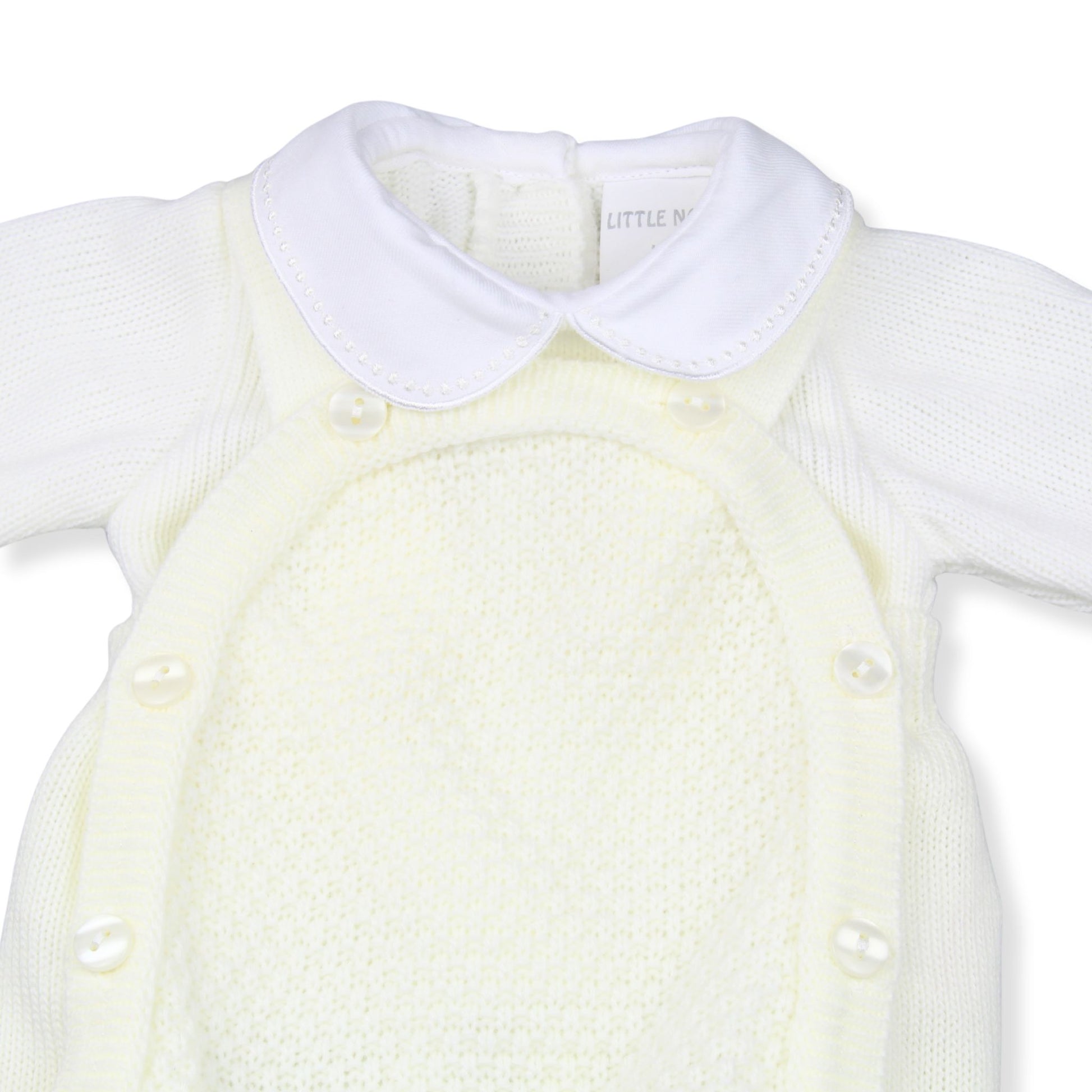 This cream two-piece Little Nosh outfit includes a knitted romper with braces that cross over at the back and secure at the front with buttons, and a long-sleeved knitted shirt with a Peter Pan collar. Crafted from a high-quality Portuguese knit, the set is available from newborn size up to 3-6 months.