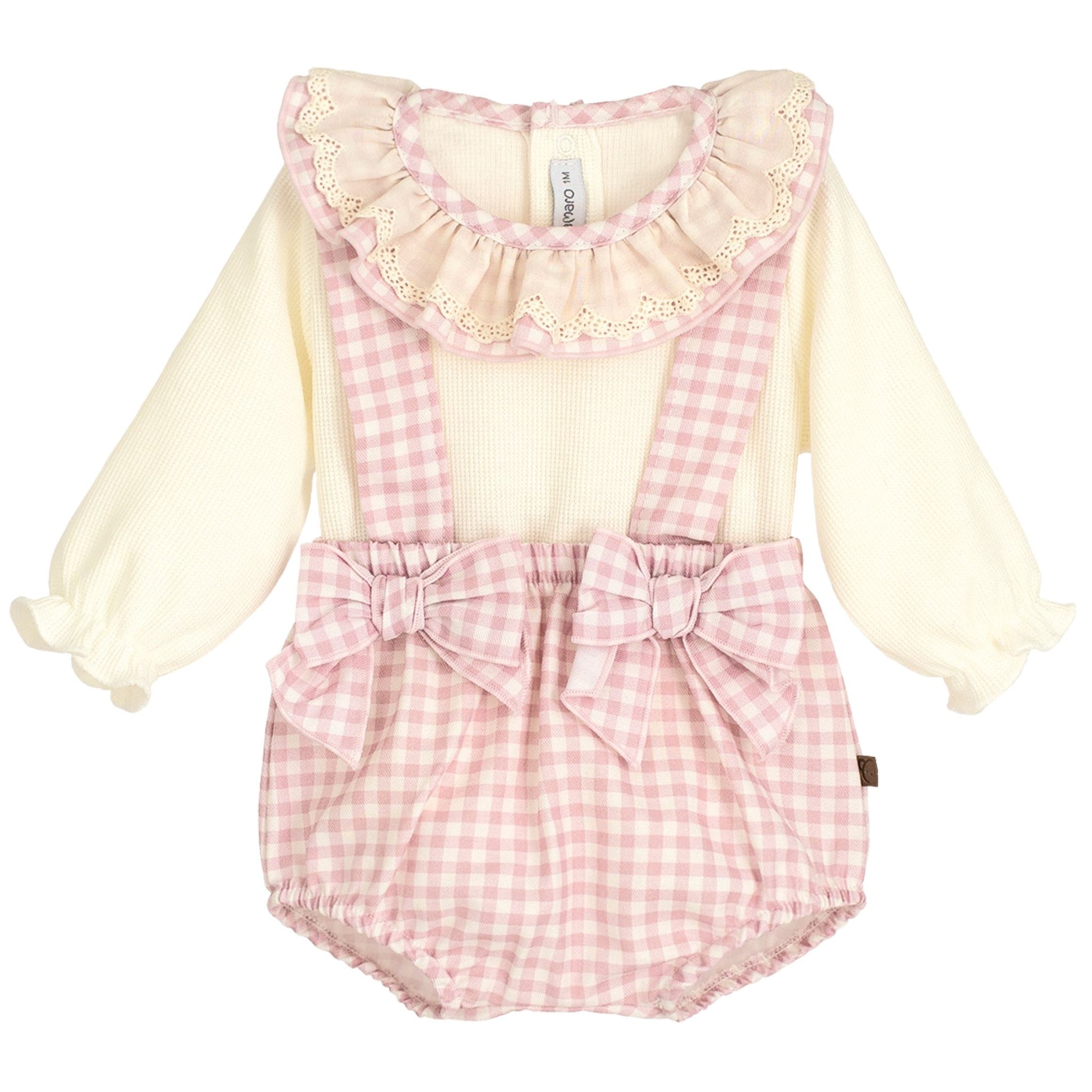 This cream and pink gingham baby romper is full of thoughtful details and timeless charm. The outfit features a soft cream long-sleeved top with a ruffled collar trimmed in broderie anglaise, perfectly complementing the pink gingham bubble romper. Fixed shoulder straps, two front bows, and elasticated leg openings complete this sweet one-piece look. Easy snap fastenings make changes quick and fuss-free. Brand: Calamaro