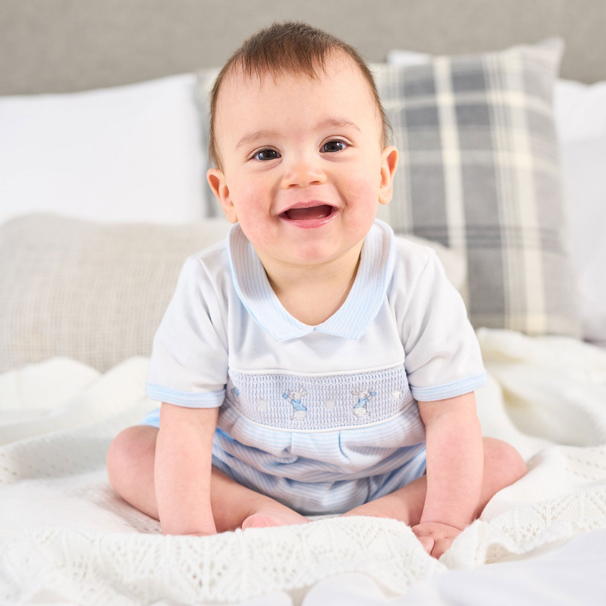 Dandelion Baby Boys Blue & White Romper – Smocked with Bunny Embroidery