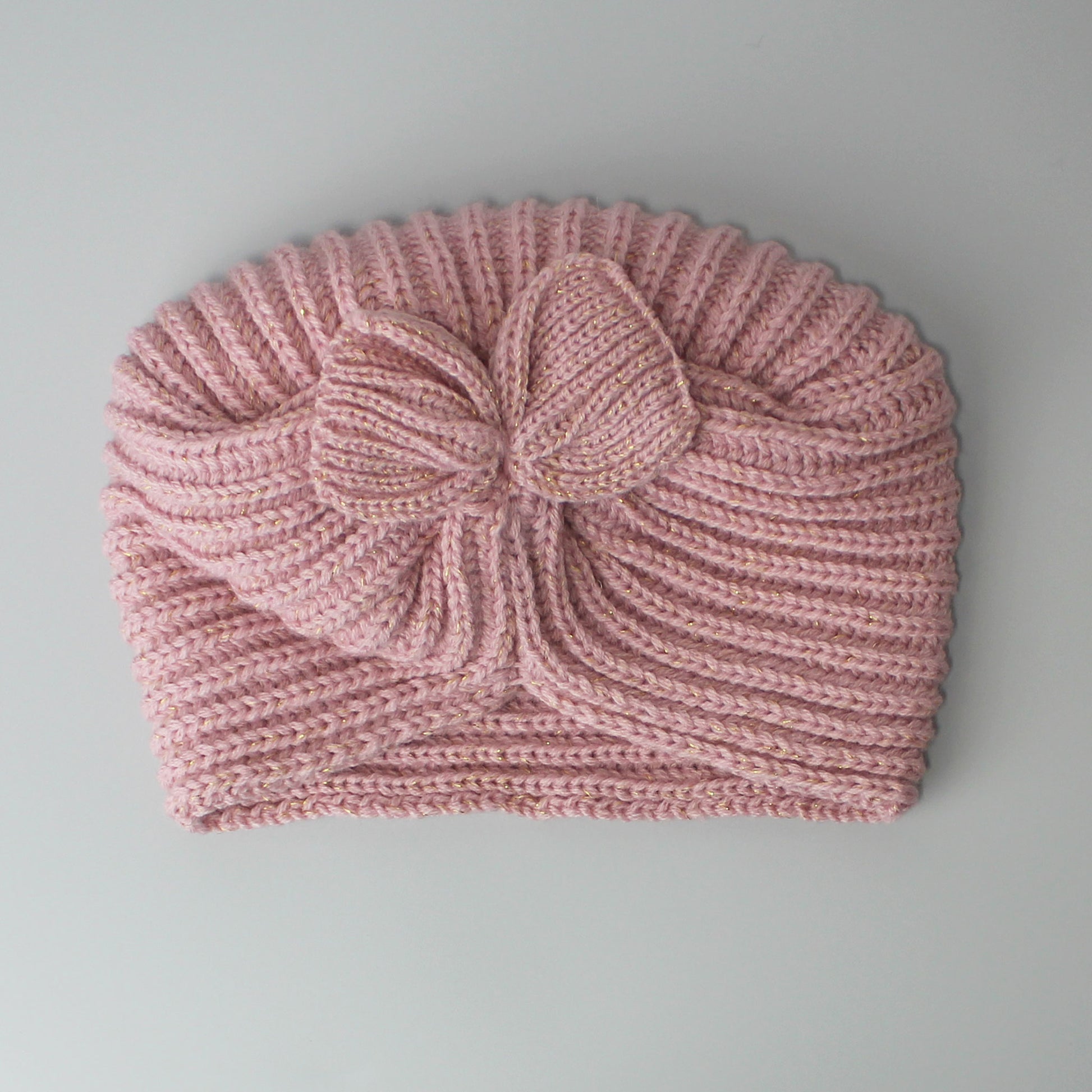 Cute little baby girl pink knitted turban hat. This pink hat has flecks of gold that sparkle in the light, Two Sizes. Newborn and 0-3 months.