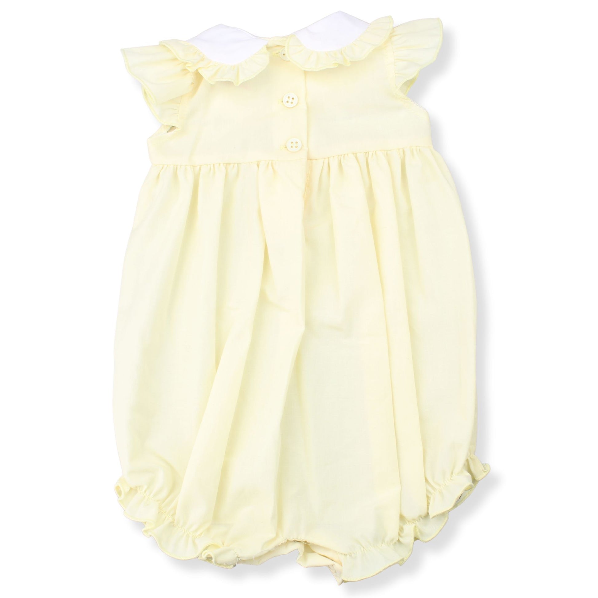 This adorable lemon romper from My Little Chick is a sweet choice for spring, Easter, or sunny days out. Made in a soft cotton blend, it features ruffled cap sleeves, a crisp white Peter Pan collar, and a satin bow beneath the button placket for a dainty finish.