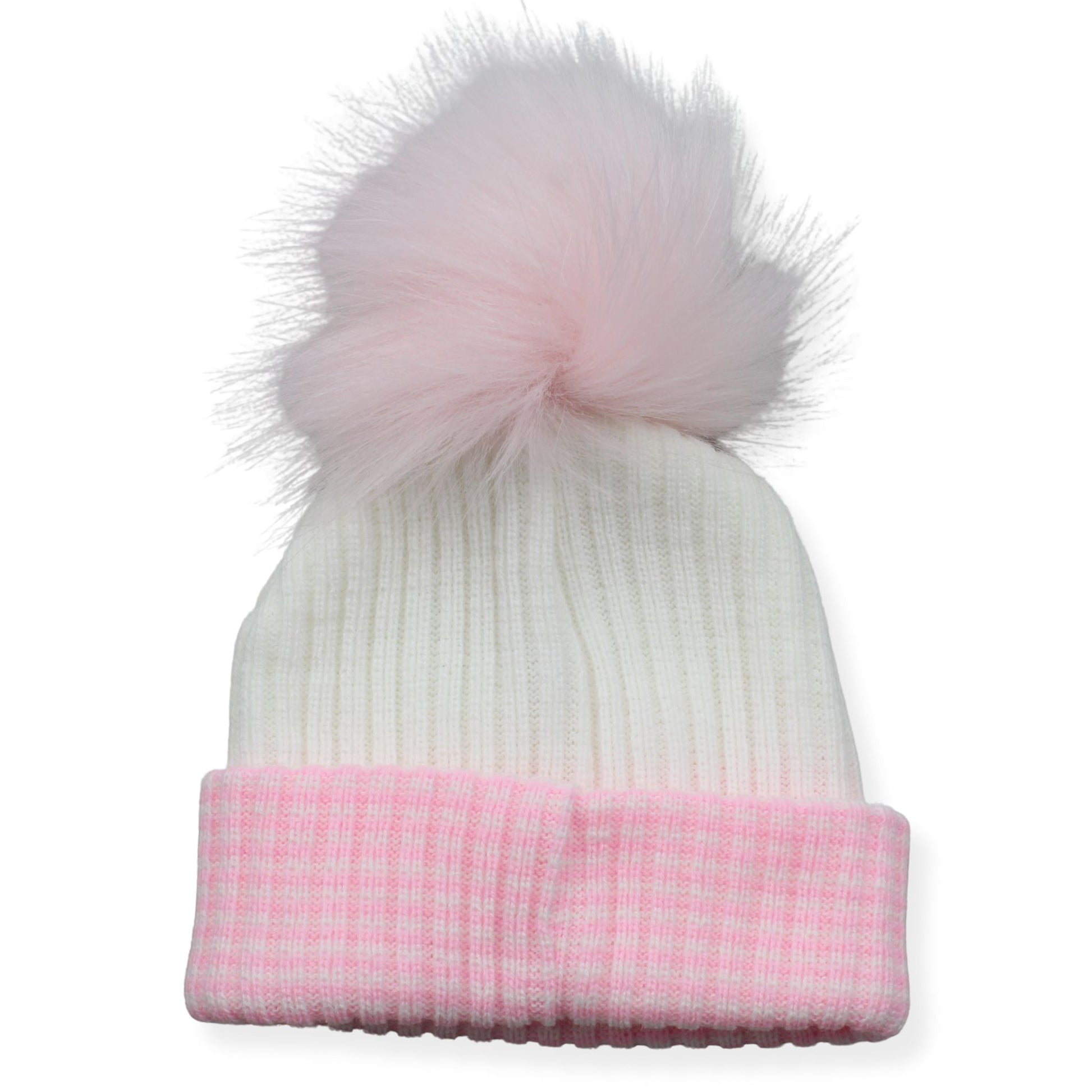 Newborn Baby White Candy Pink Faux Fur Pom Pom Hat-First Size