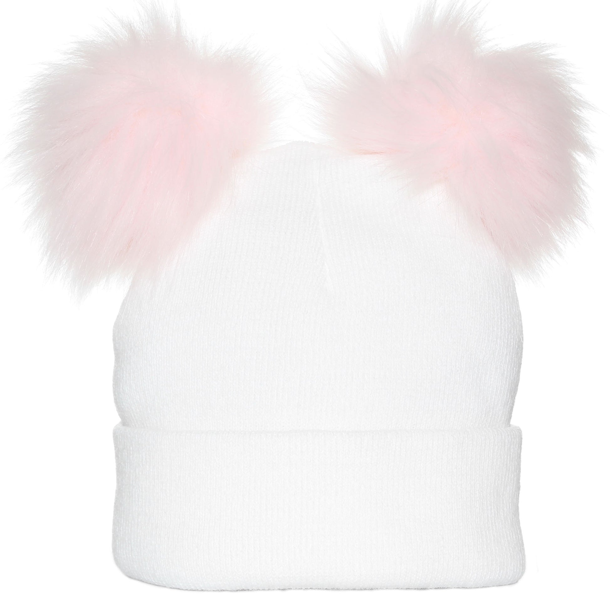 This toddler hat is pastel white with two pastel pink faux fur single pom poms.