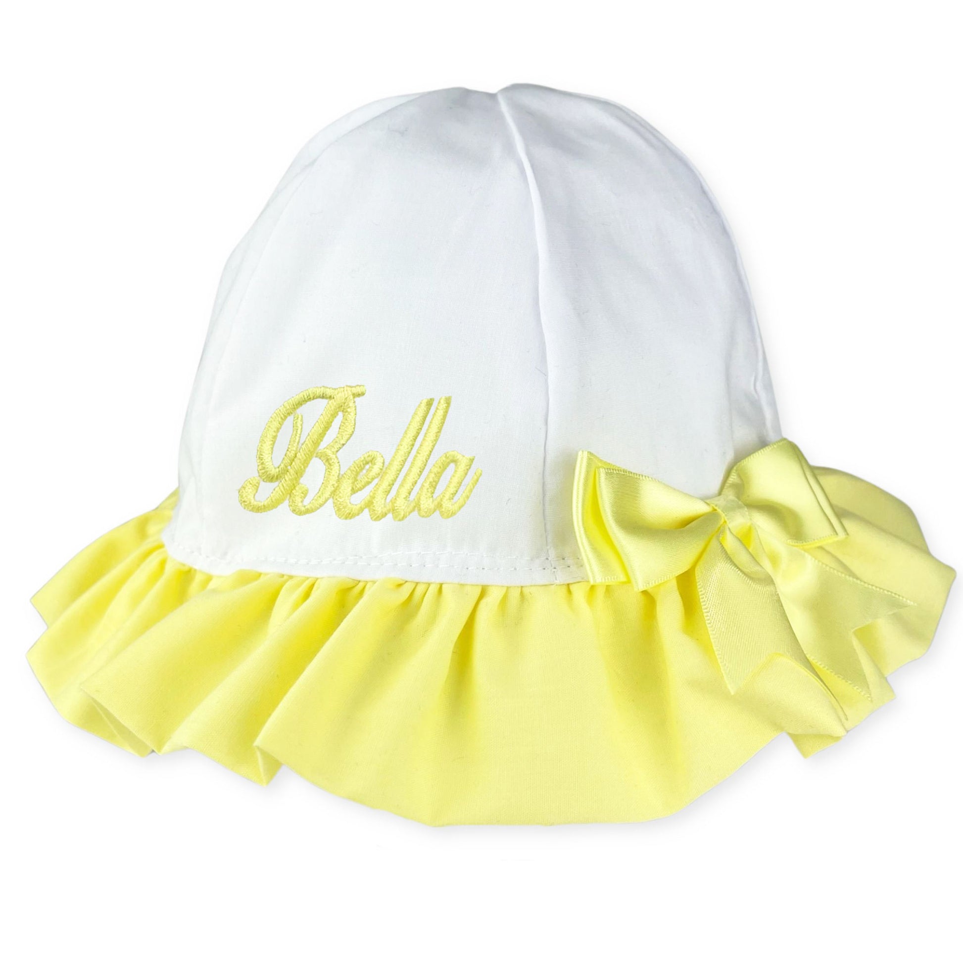 Protect your little one from the sun in style with our Personalised Baby Girls Sunhat - Lemon & White. Made in the UK with high-quality materials, this sun hat features a charming white bow on the front. Available in three sizes, it's the perfect accessory to pair with our lovely lemon dresses. Keep your baby girl looking cute and fashionable while keeping her safe from the sun.
