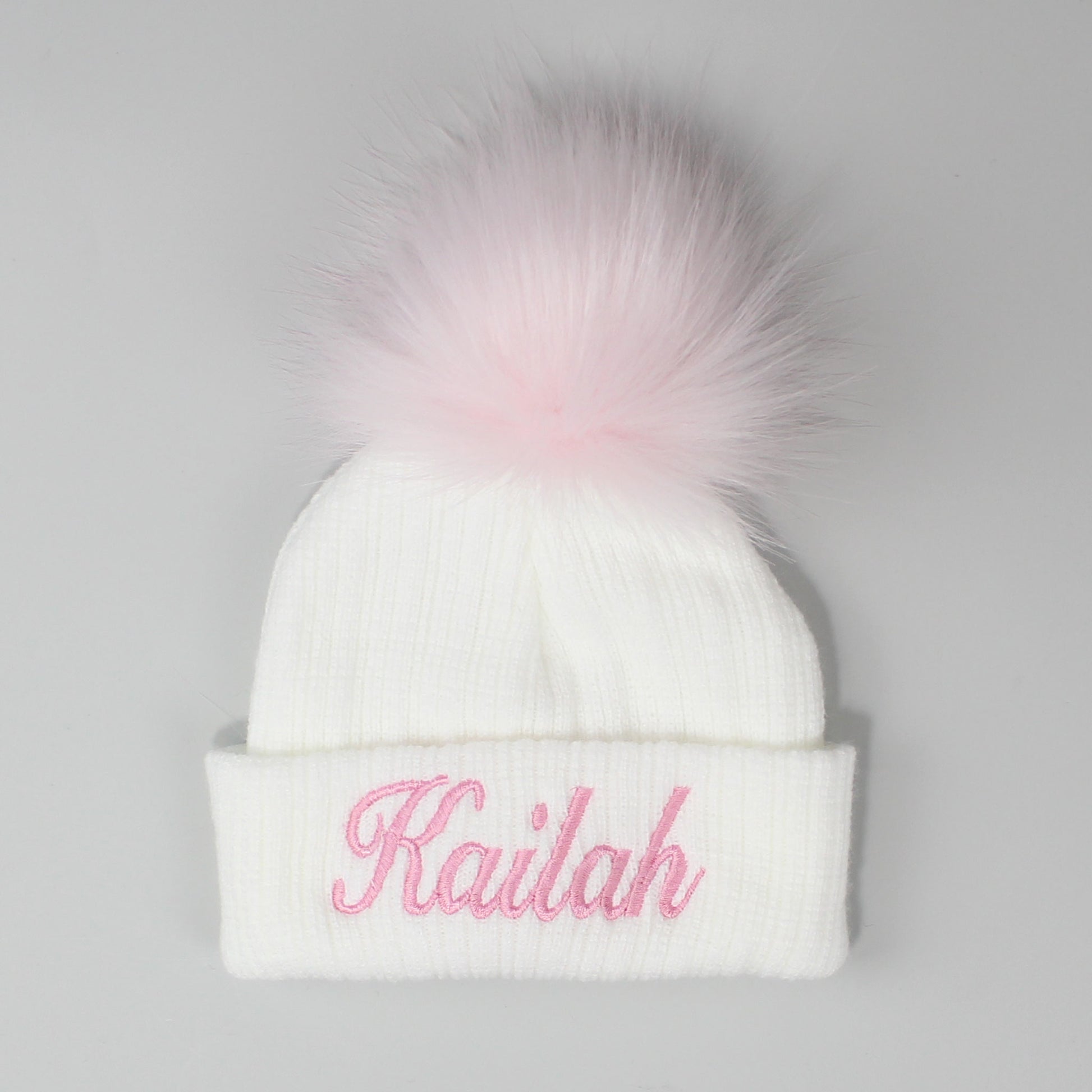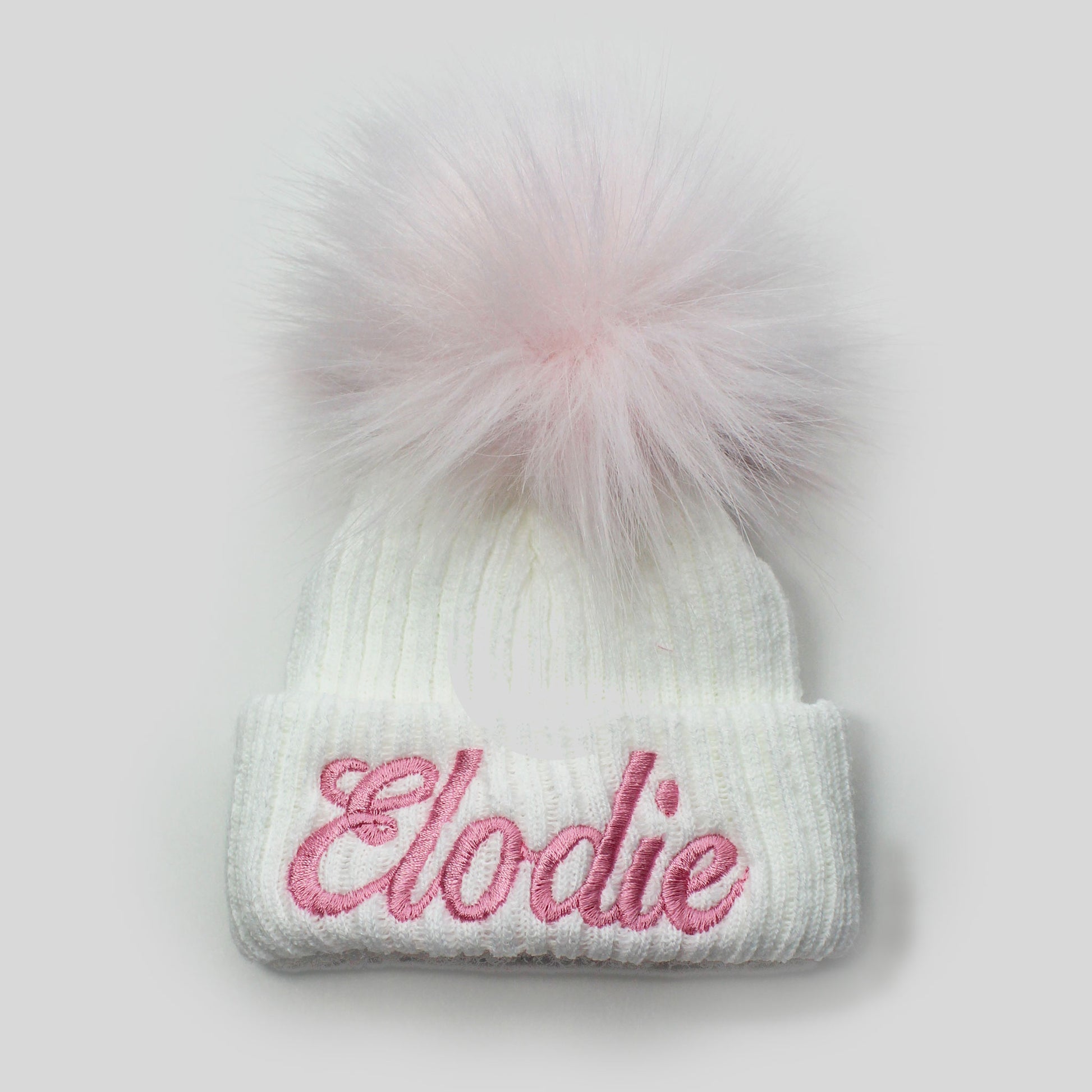 We will personalise this little hat in your choice of colour, we recommend baby pink writing to match the fluffy little faux fur pom.