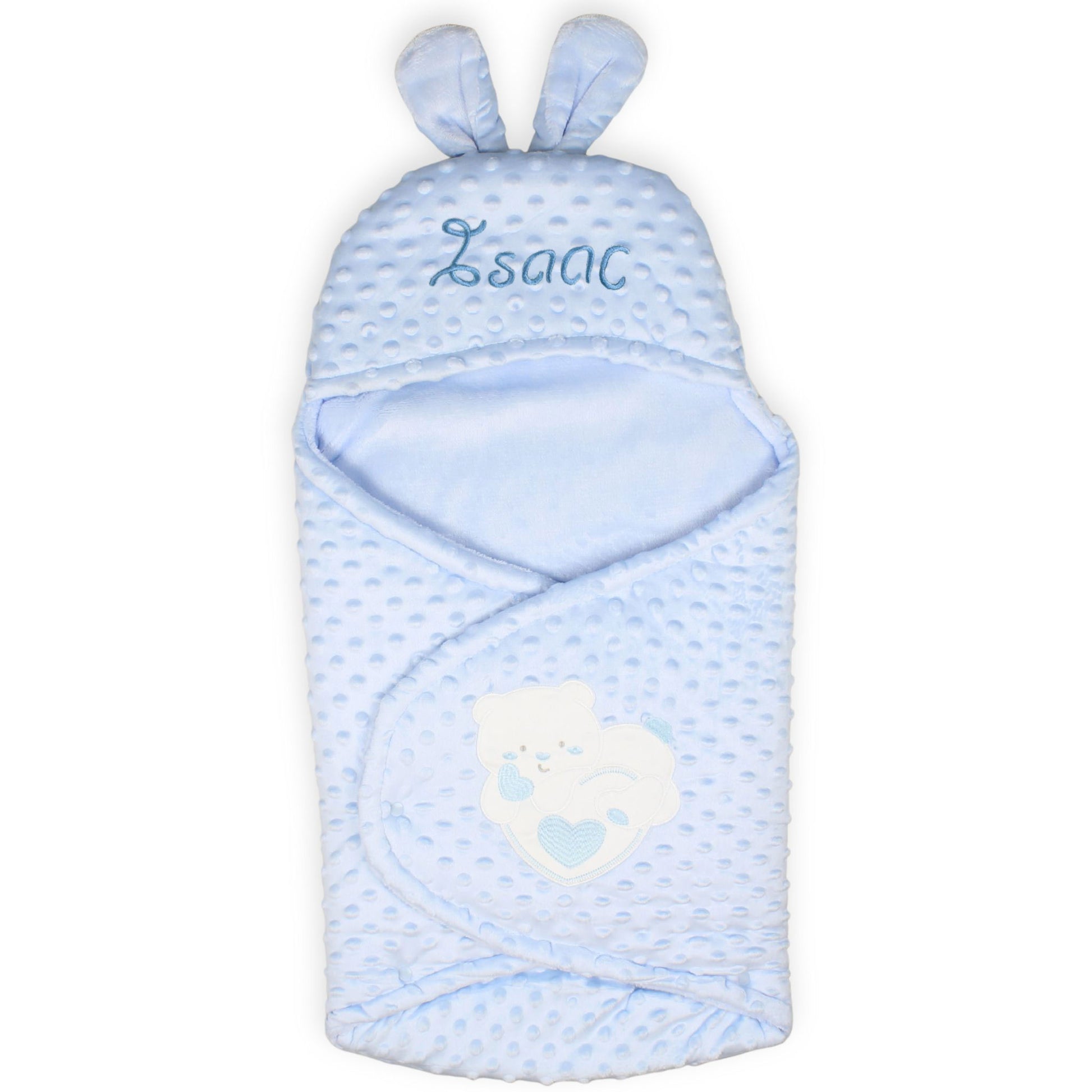Personalised Blue Dimple Baby Swaddle Wrap with Bunny Ears & Teddy Bear Embroidery