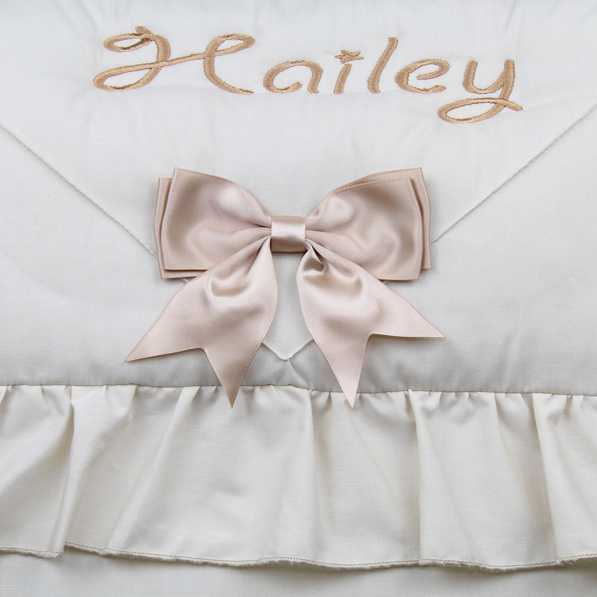 Beige Cosy Toes / Footmuff. Unisex, very high quality and made in the UK. Universal fitting. Front will zip off so can also be used to line pushchair / stroller or pram. The front of the footmuff also has two cute white satin bows. Highly padded to keep your little one comfortable and warm. Just add your baby's name, choose a font and colour and we will professionally embroider this footmuff!