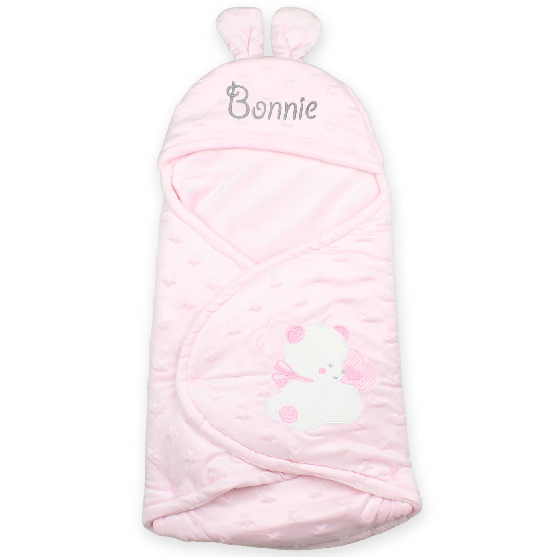 Personalised Pink Baby Swaddle Wrap with Bunny Ears & Teddy Bear Embroidery – Ultra Soft Fleece