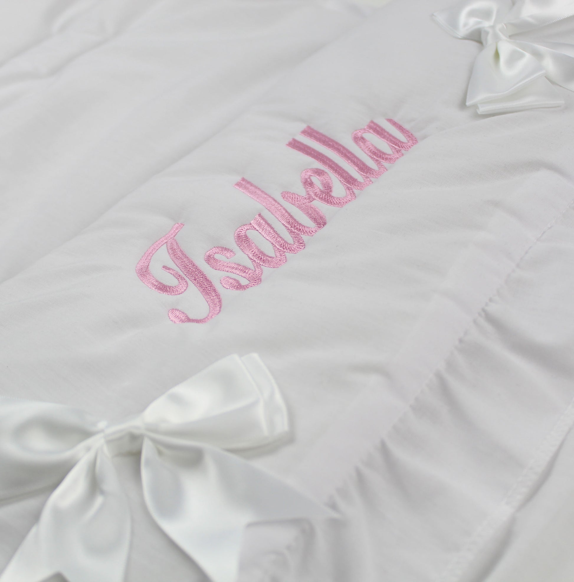White personalised Cosy Toes / Footmuff with three white bows and slotted detail going down the middle. Baby's name will be embroidered to the front of the cosytoes. Very high quality and made in the UK. Universal fitting. Front will zip off so can also be used to line pushchair / stroller or pram.