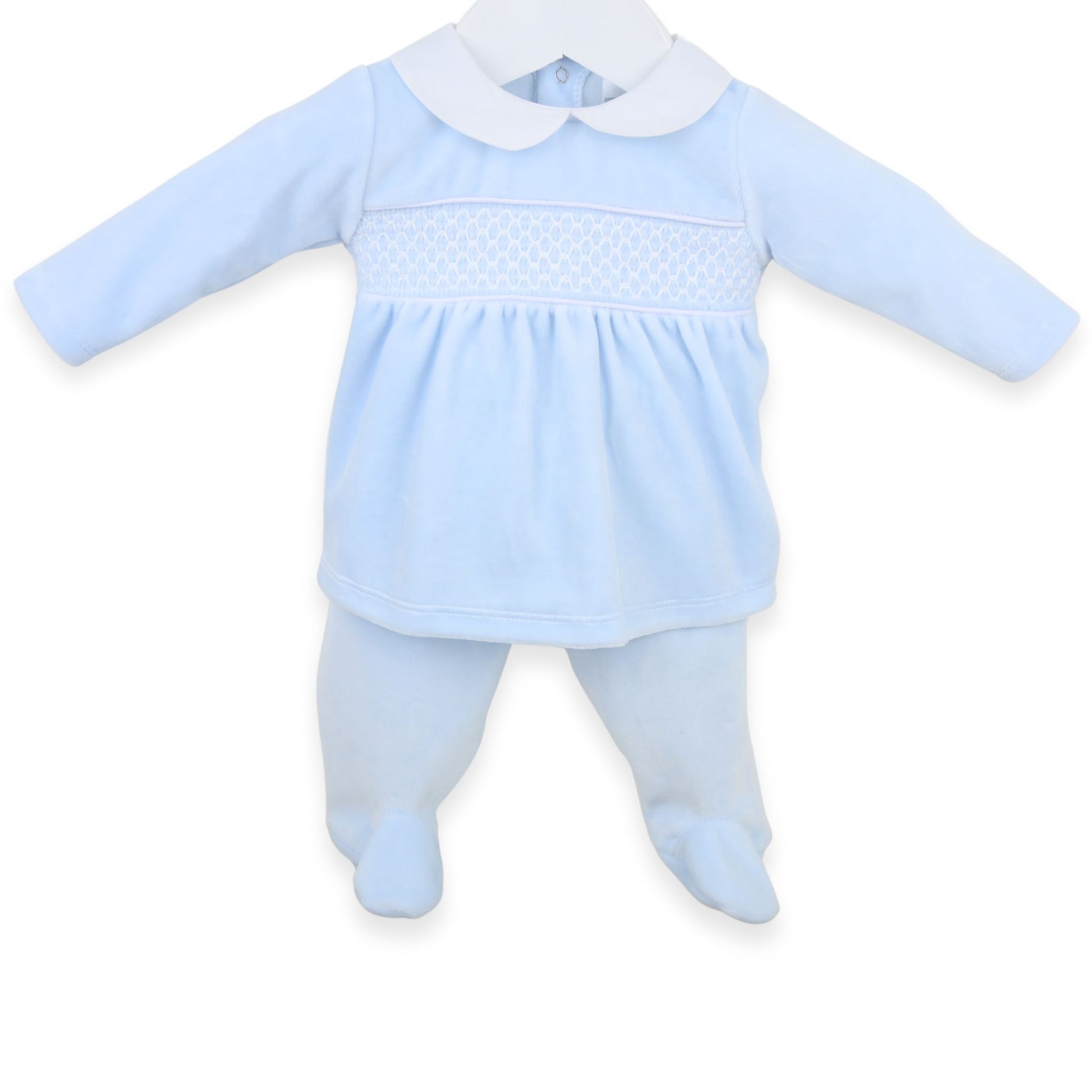 A traditional two-piece outfit for baby boys by PEX, crafted in soft blue velour for warmth and comfort. The long-sleeved top features a crisp white Peter Pan collar and delicate smocking across the chest, giving a timeless look. Paired with matching footed trousers to keep little toes snug, this set is both practical and stylish.