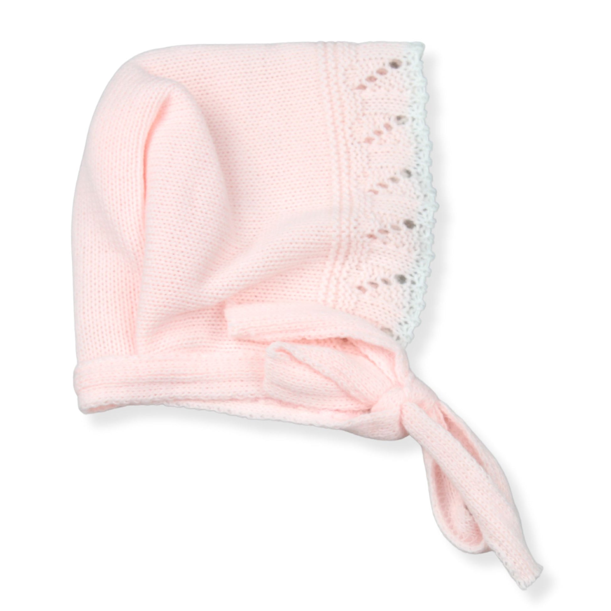 This beautiful girls three-piece delicate cable knitted set is made in Portugal using soft, high-quality yarn. The set includes a long-sleeved knitted jumper with lace knitted hem and cute satin white bow, matching footed trousers, and a coordinating traditional style bonnet.