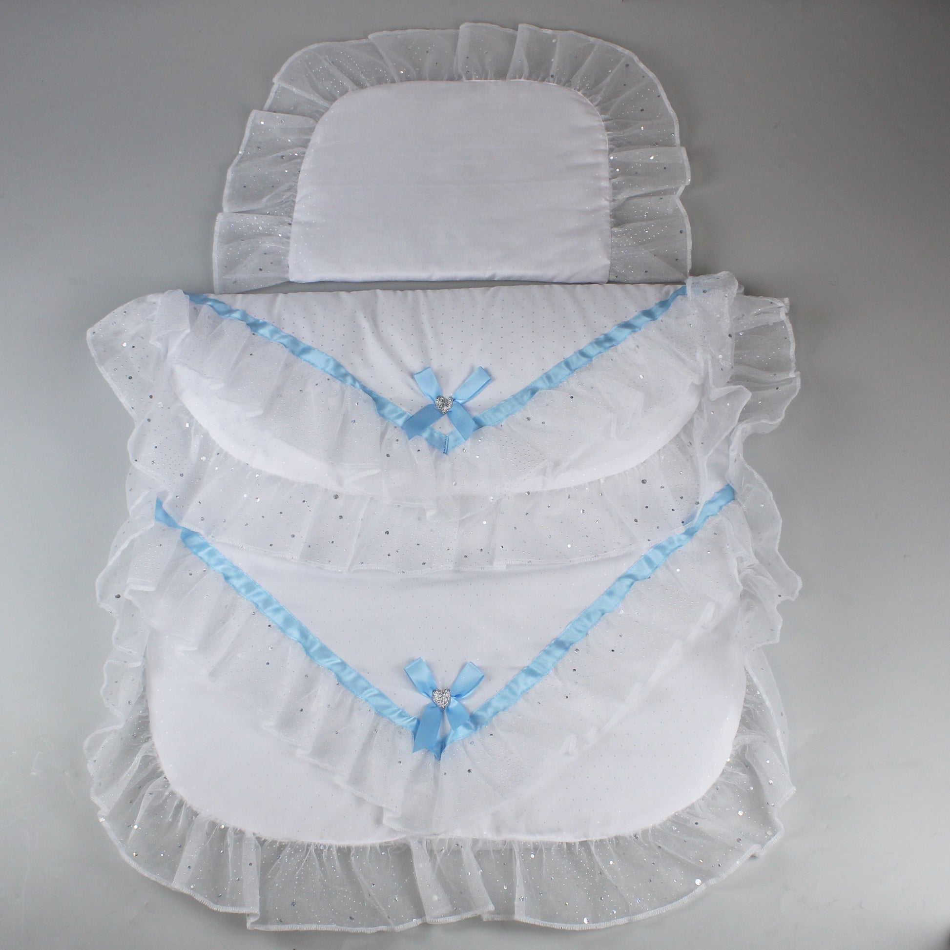 This stunning pram set, is white with blue ribbon detailing. It is trimmed in white organza, with sequin embellishments. Perfect for your baby boy.The quilt measures 40cm wide x 50 cm long (not including fold over flap to front.) The pillow approx 30cm x 25 cm. Will fit a wide range of prams, including the more traditional Silver Cross. Very high quality and made in the UK. Universal fitting. By ordering from this page you will receive an unpersonalised pram set. To add a name / personalise this pram set please click the link below.