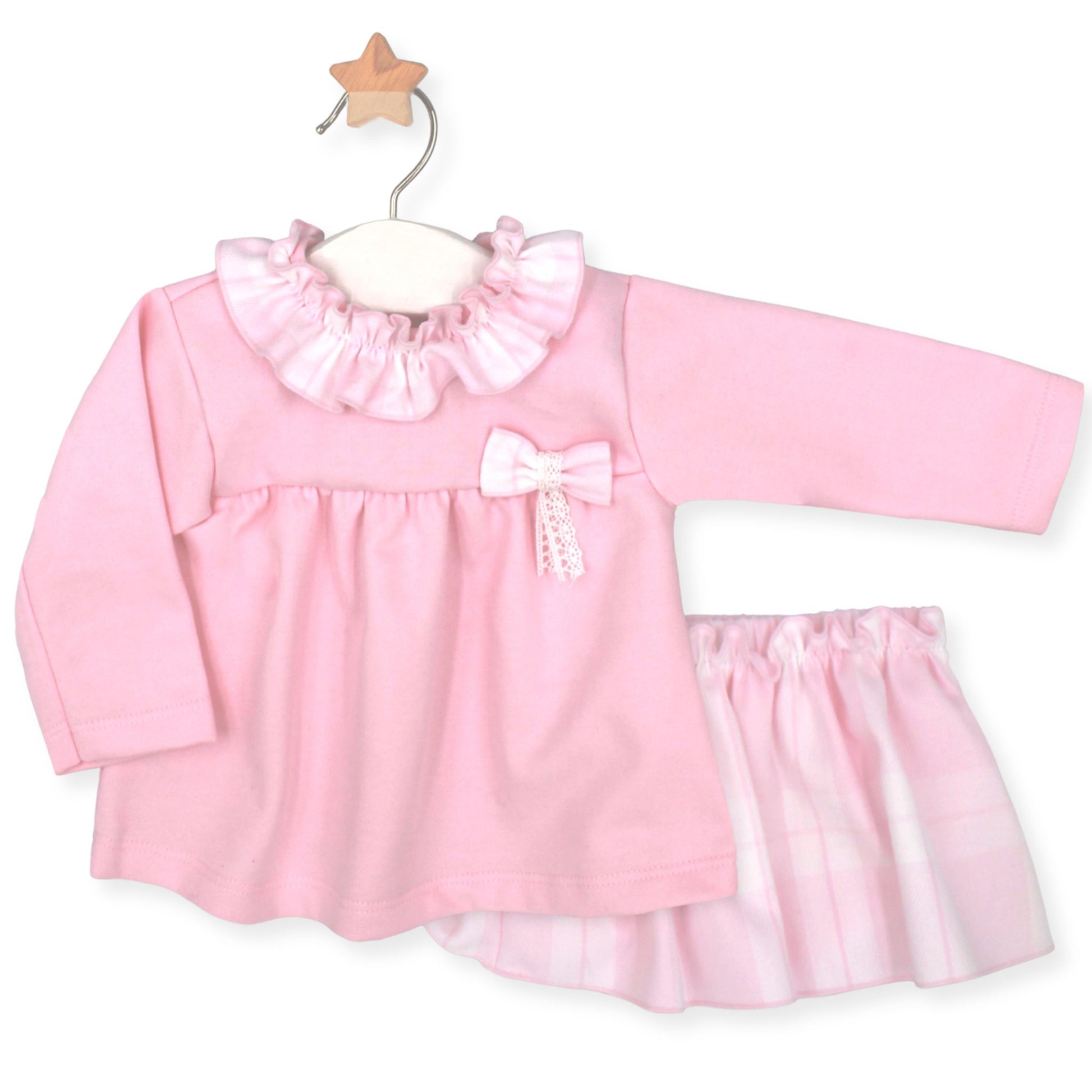 This sweet two-piece skirt set from Spanish brand Rapife is perfect for special occasions or everyday wear. Made from soft cotton, the top features a frilled neckline with soft pink stripes and a decorative bow with lace trim. It pairs beautifully with the matching elasticated pink skirt in a soft check pattern.