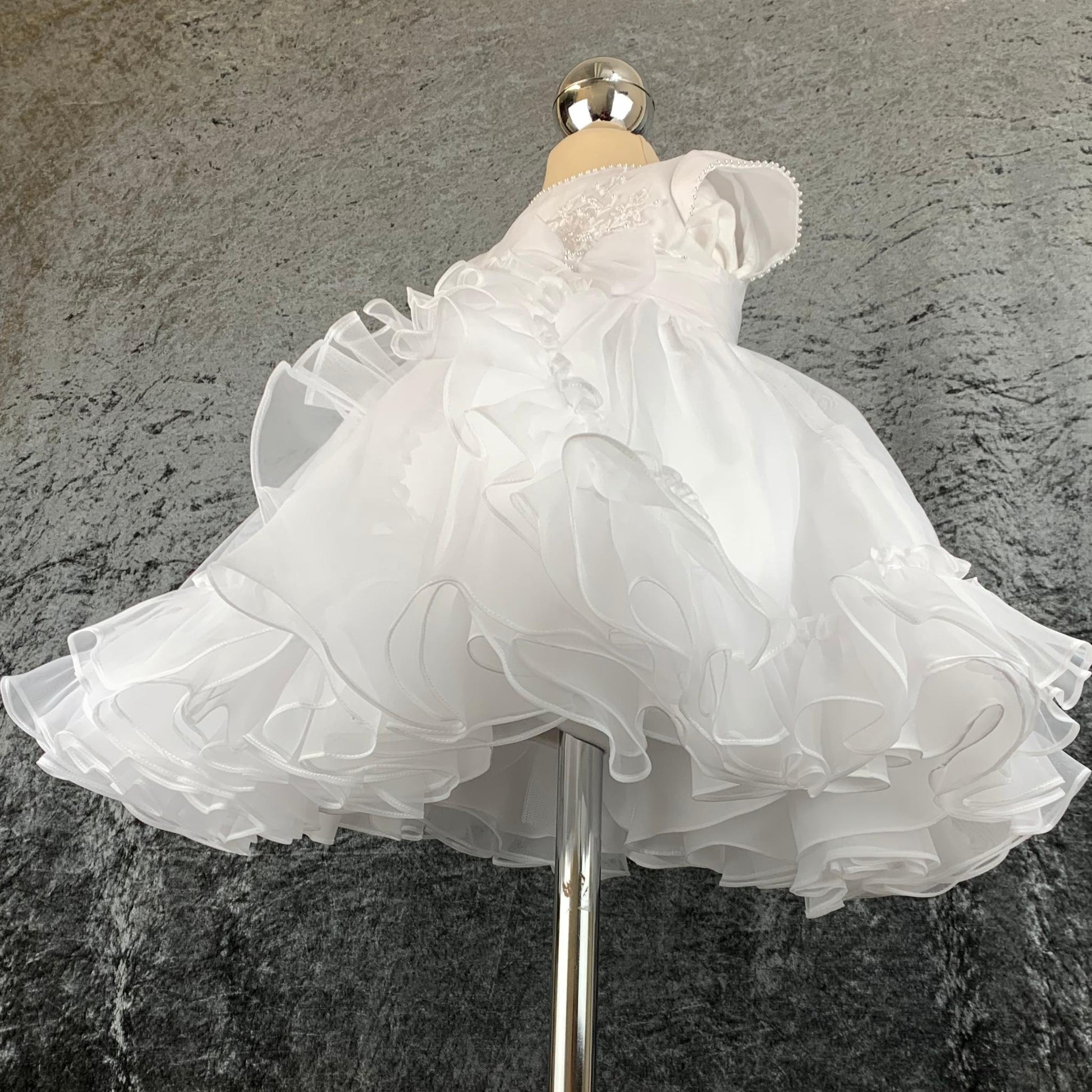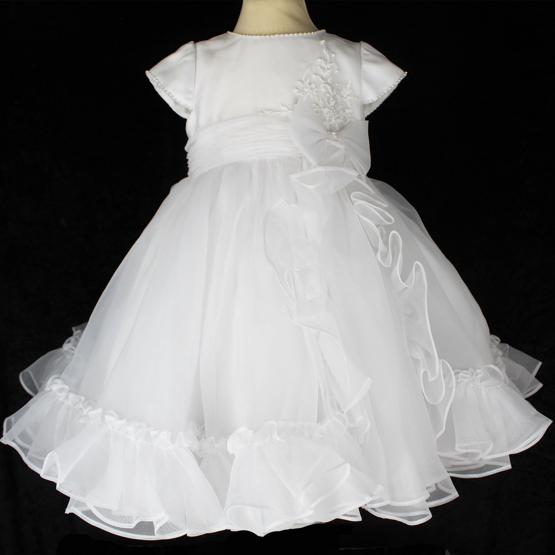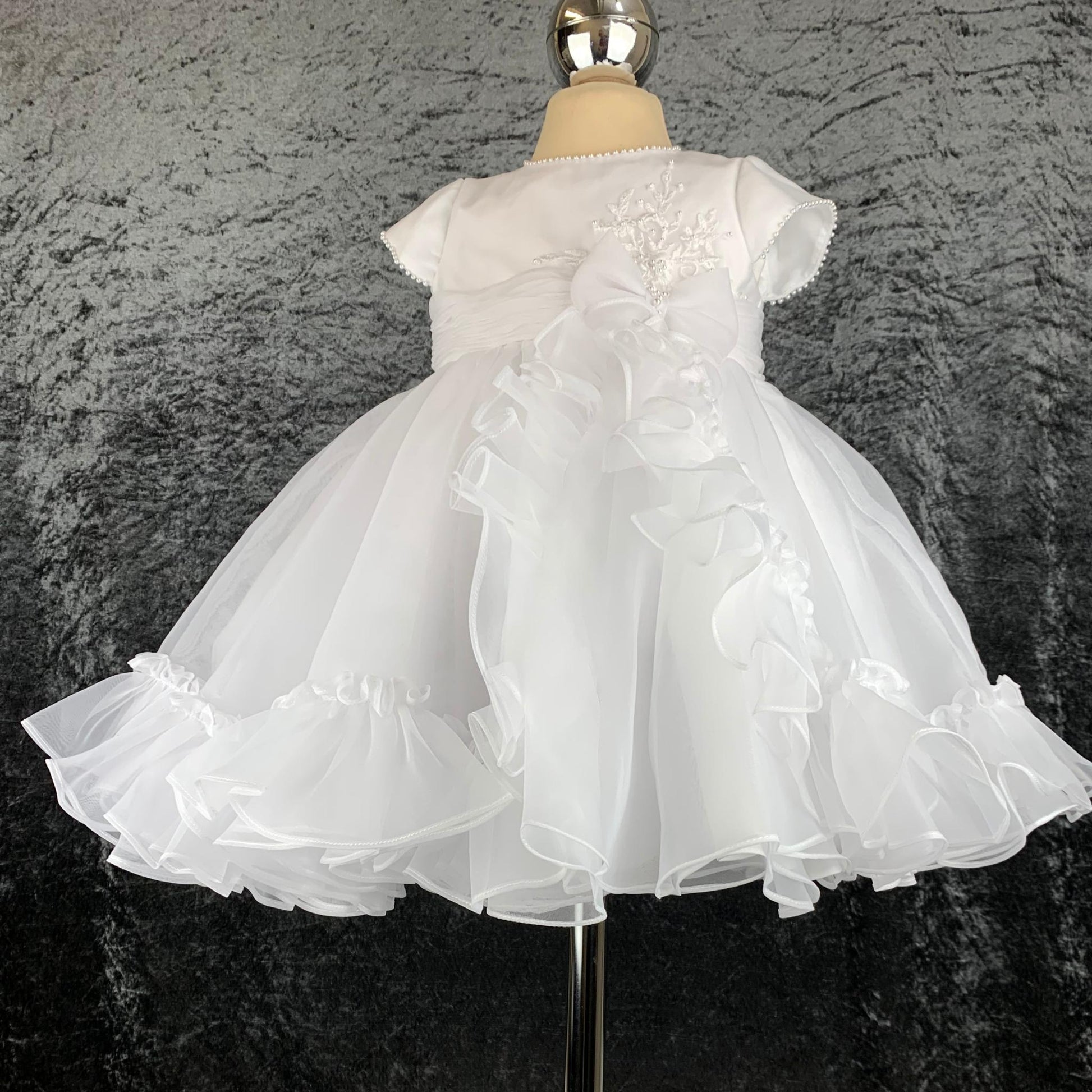 Sarah Louise Christening dress in a ballerina style. Pearls to neck and sleeves, Embroidery with pearls to bodice, and bow to front. The dress is fully lined with layers and mesh to add to the fullness of this special occasion dress.