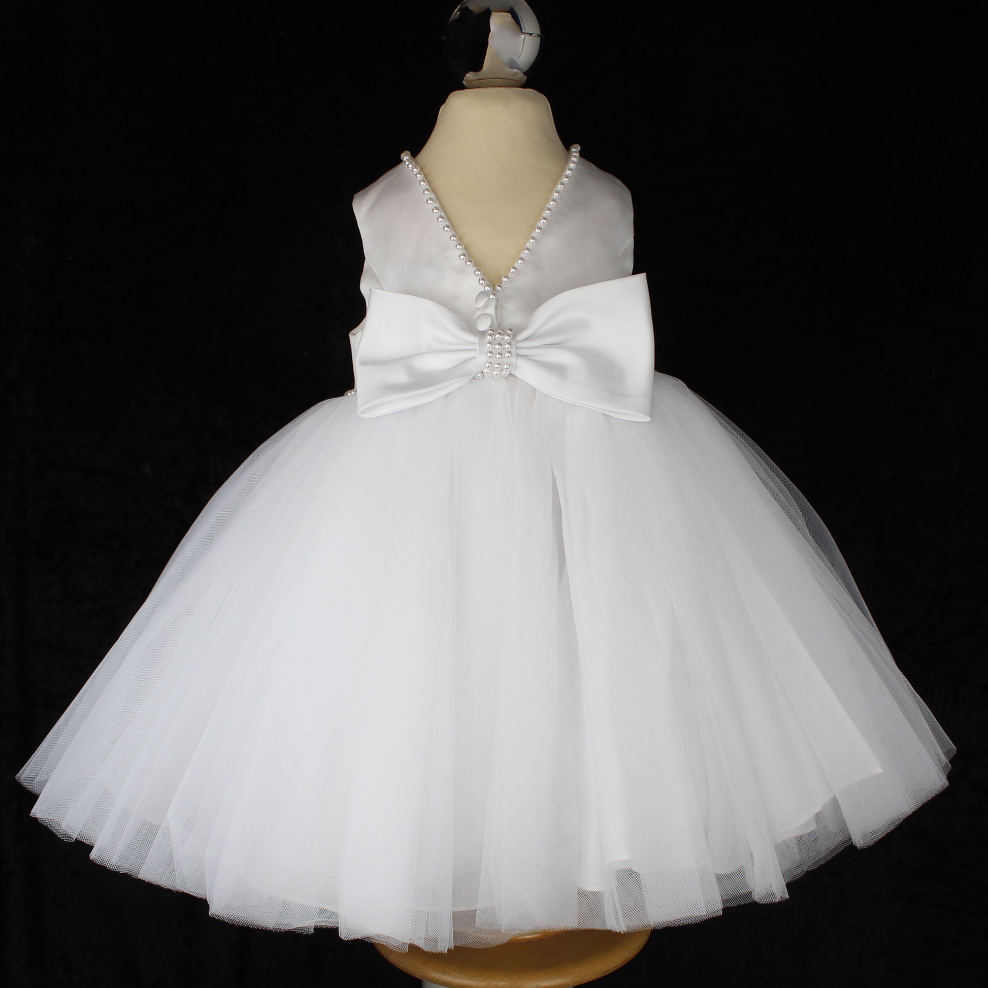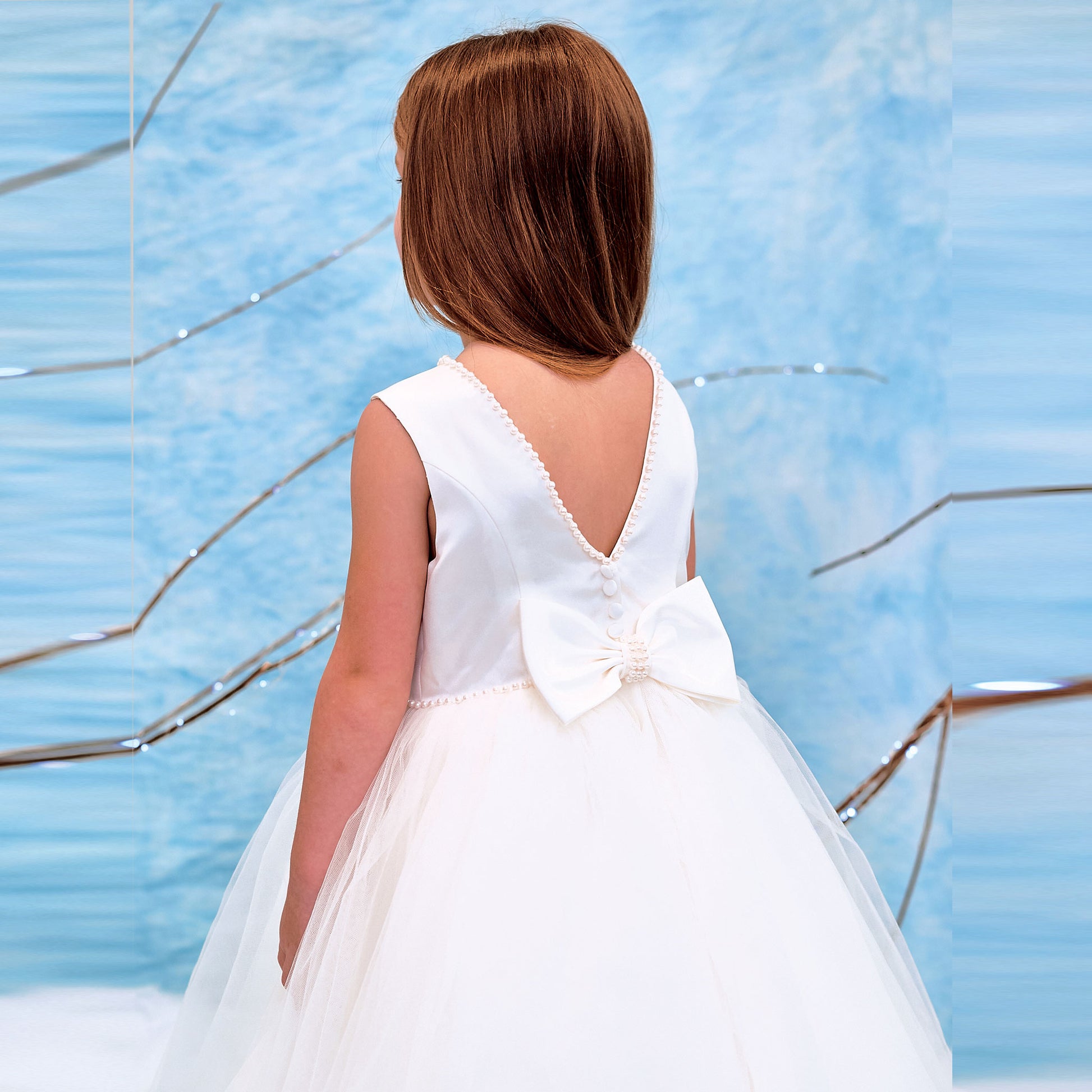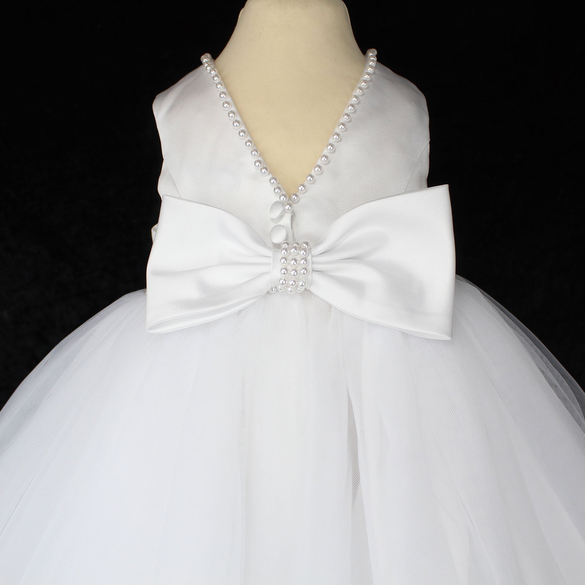 A stunning white ballerina-style occasion dress by Sarah Louise, perfect for special moments. This elegant dress features delicate pearl embellishments on the neckline and waist, adding a touch of luxury. A statement bow with pearl detailing graces the back, complementing the beautiful V-cut waistline. Fully lined with soft layers and mesh for a voluminous silhouette, this dress is ideal for christenings, communions, weddings, or flower girls. Available in sizes 6 months to 4 years.