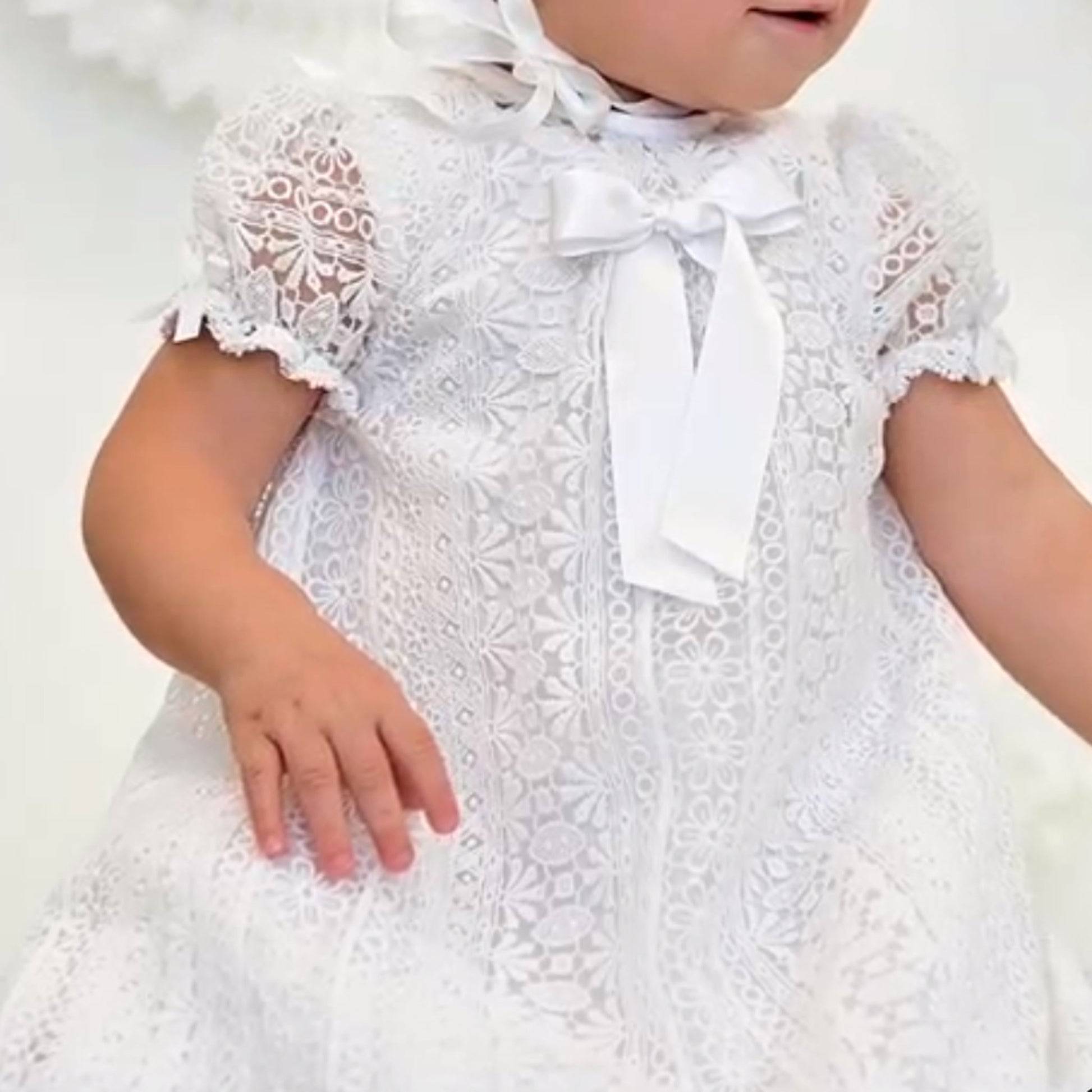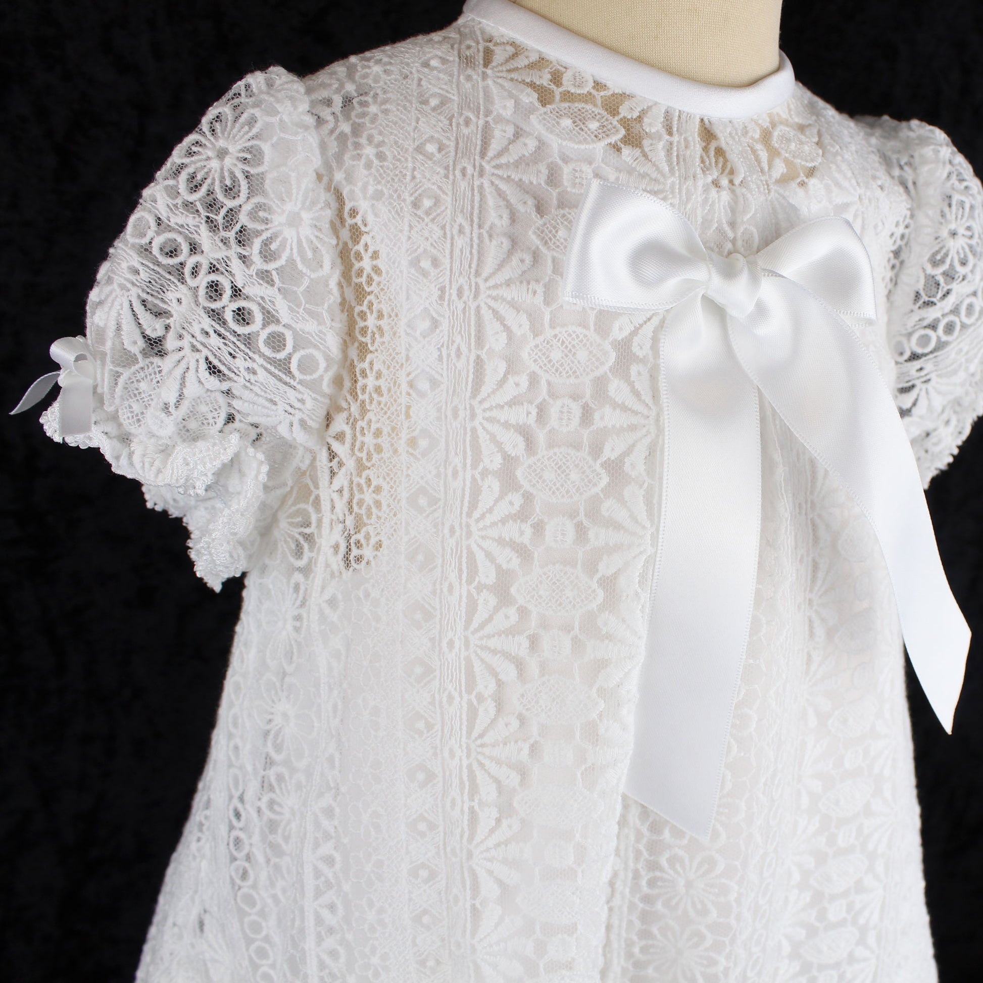 Sarah Louise traditional long ceremonial Christening gown with bonnet. This gown features a separate underslip. Beautiful heavy lace-over dress with a satin bow to the front. This timeless piece is sure to be passed down for generations! Get ready to ooh and aah over those photo ops; they'll be something to cherish for years to come.
