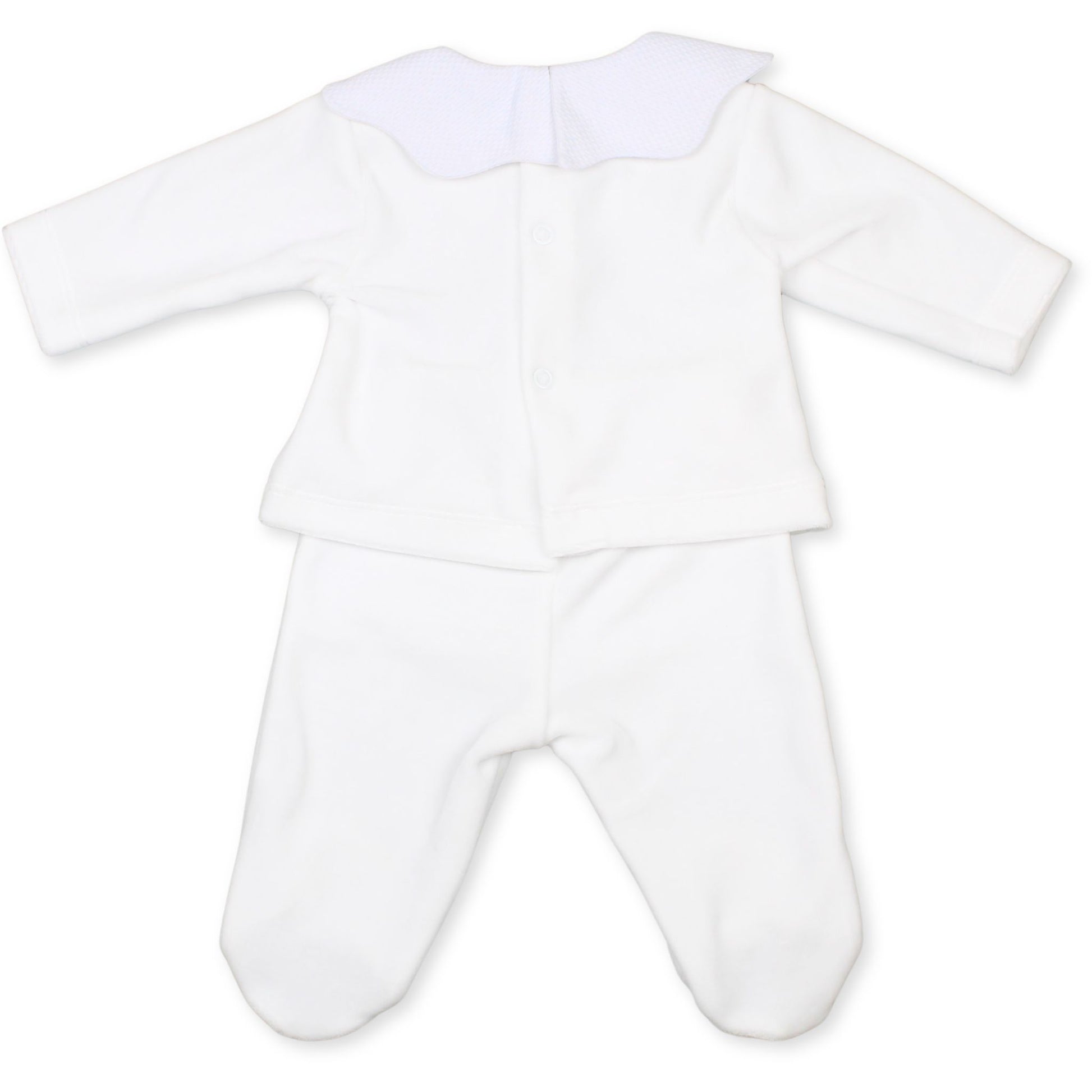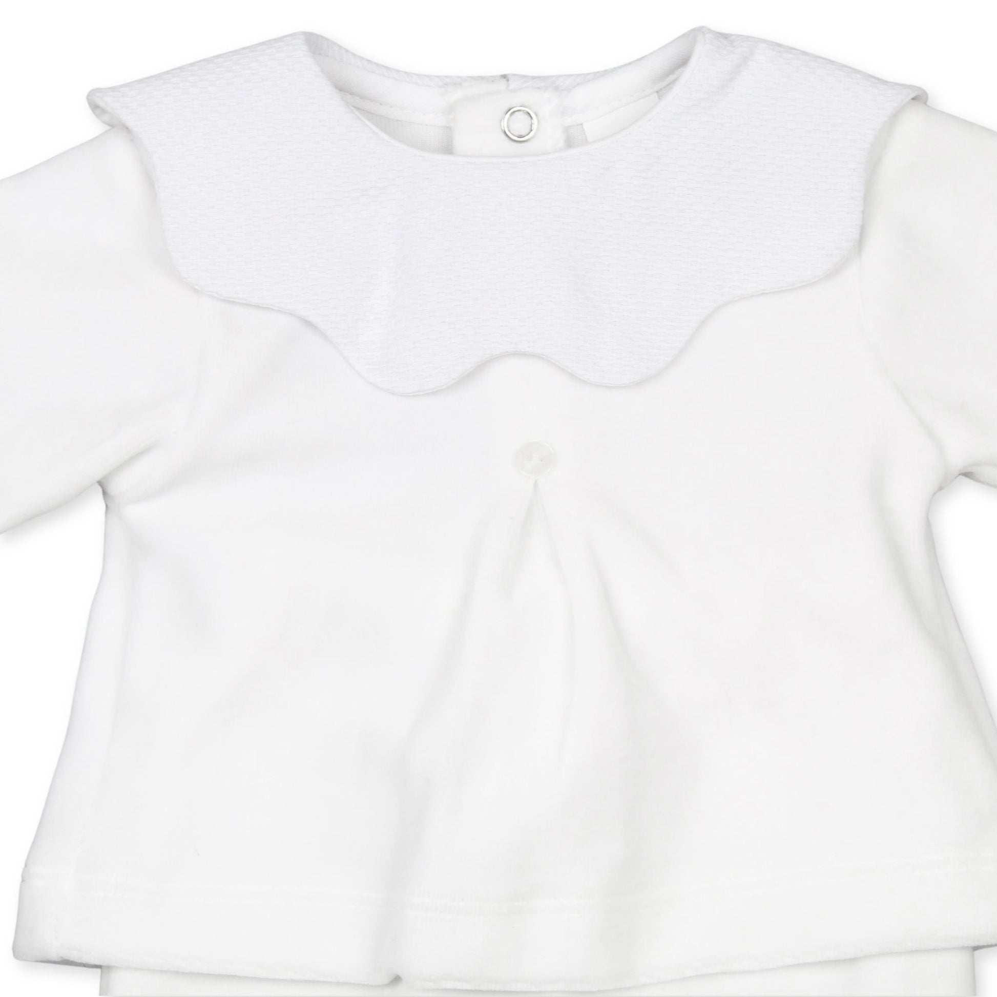 This timeless white two-piece outfit is crafted from velour with a white scallop collar and features poppers for secure closure at the back. Included feet and an elasticated waistband for extra warmth and comfort, creating a stylish and cosy look for the newest family member.