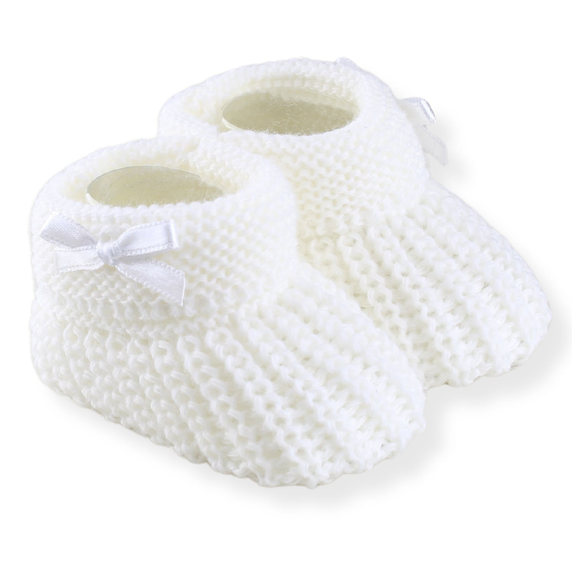 White knitted booties suitable for newborn baby to 6 month baby. Rollover top with white bow to side. Perfect for little feet.